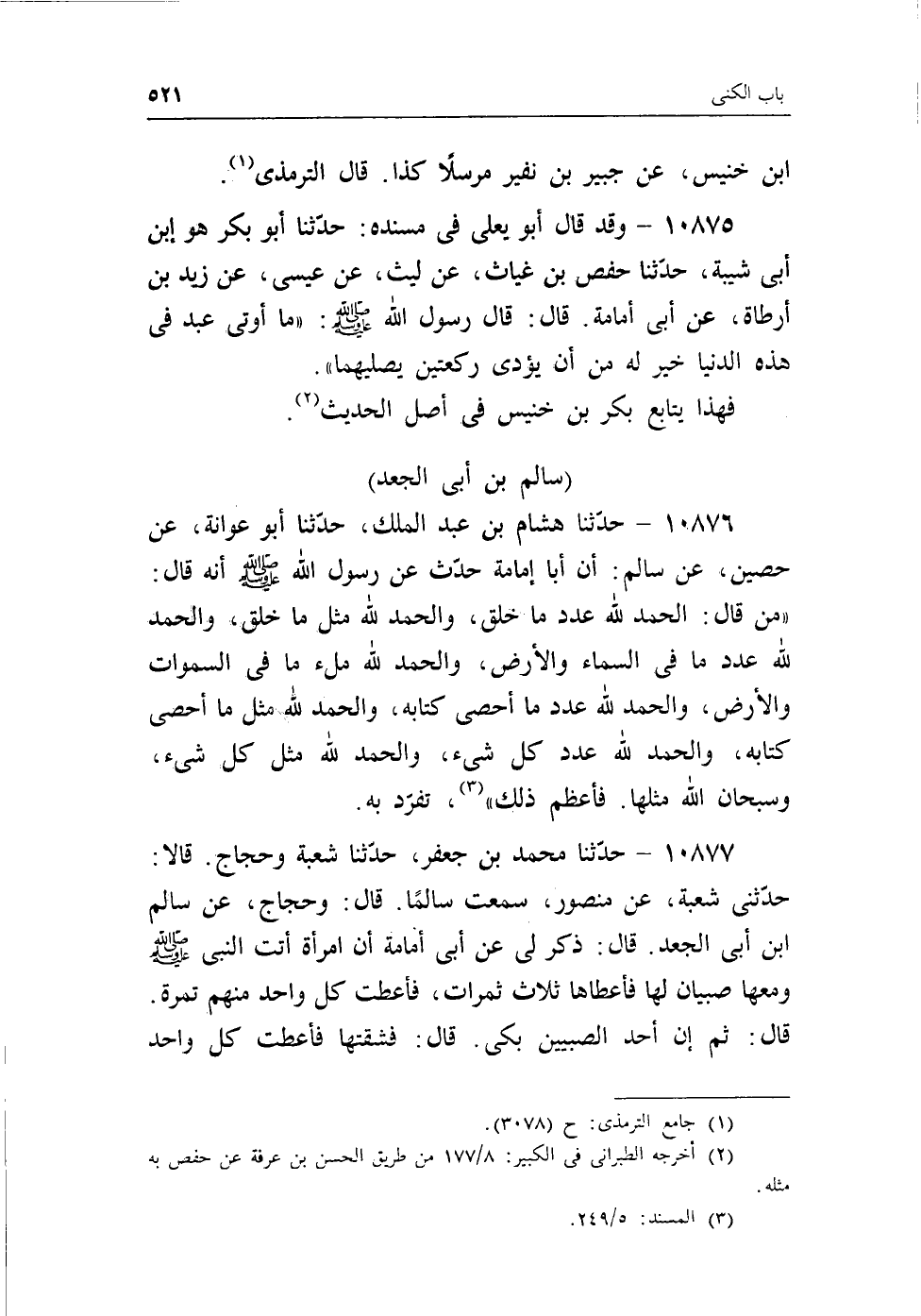 10876 - حدثنا هشام بن عبد الملك، حدثنا أبو عوانة، عن حصين، عن سالم: أن أبا إمامة حدث عن رسول الله - صلى الله عليه وسلم - أنه قال: «من قال: الحمد لله عدد ما خلق، والحمد لله مثل ما خلق، والحمد لله عدد ما فى السماء والأرض، والحمد لله ملء ما فى السموات والأرض، والحمد لله عدد ما أحصى كتابه، والحمد لله مثل ما أحصى كتابه، والحمد لله عدد كل شىء، والحمد لله مثل كل شىء، وسبحان الله مثلها. فأعظم ذلك» (¬2) ، تفرد به.