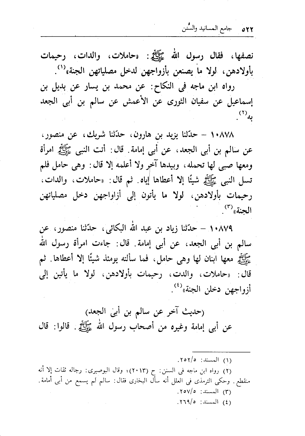 10879 - حدثنا زياد بن عبد الله البكائى، حدثنا منصور، عن سالم بن أبى الجعد، عن أبى إمامة. قال: جاءت امرأة رسول الله - صلى الله عليه وسلم - معها ابنان لها وهى حامل، فما سألته يومئذ شيئاً إلا أعطاها. ثم قال: «حاملات، والدت، رحيمات بأولادهن، لولا ما يأتين إلى أزواجهن دخلن الجنة» (¬2) .