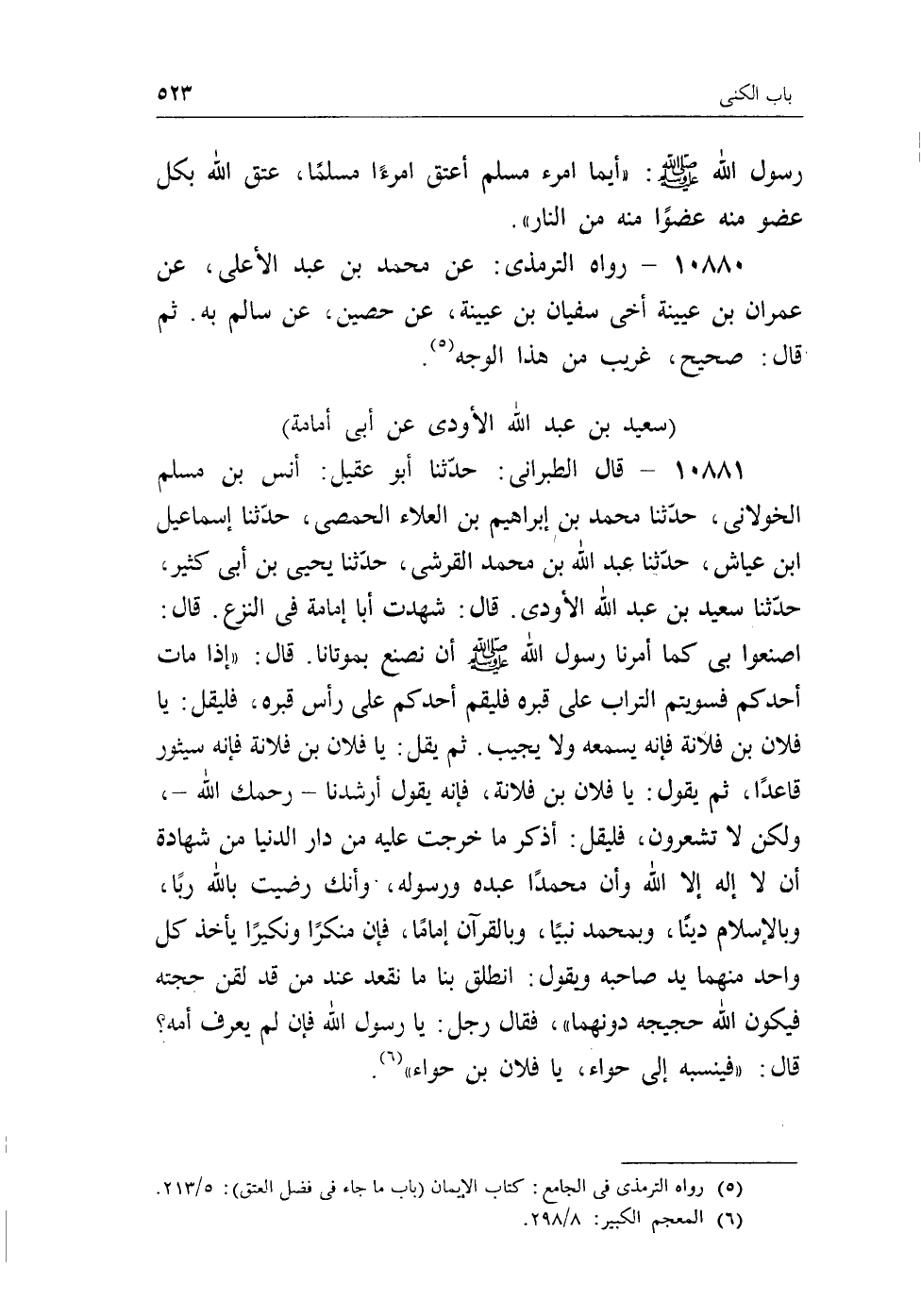 10881 - قال الطبرانى: حدثنا أبو عقيل: أنس بن مسلم الخولانى، حدثنا محمد بن إبراهيم بن العلاء الحمصى، حدثنا إسماعيل بن عياش، حدثنا عبد الله بن محمد القرشى، حدثنا يحيى بن أبى كثير، حدثنا سعيد بن عبد الله الأودى. قال: شهدت أبا إمامة فى النزع. قال: اصنعوا بى كما أمرنا رسول الله - صلى الله عليه وسلم - أن نصنع بموتانا. قال: «إذا مات أحدكم فسويتم التراب على قبره فليقم أحدكم على رأس قبره، فليقل: يا فلان بن فلانة فإنه يسمعه ولا يجيب. ثم يقل: يا فلان بن فلانة فإنه سيثور قاعداً، ثم يقول: يا فلان بن فلانة، فإنه يقول أرشدنا ـ رحمك الله ـ، ولكن لا تشعرون، فليقل: أذكر ما خرجت عليه من دار الدنيا من شهادة أن لا إله إلا الله وأن محمداً عبده ورسوله، وأنك رضيت بالله رباً، وبالإسلام ديناً، وبمحمد نبياً، وبالقرآن إماماً، فإن منكراً ونكيراً يأخذ كل واحد منهما يد صاحبه ويقول: انطلق بنا ما نقعد عند من قد لقن حجته فيكون الله حجيجة دونهما» ، فقال رجل: يا رسول الله فإن لم يعرف أمه؟ قال: «فينسبه إلى حواء، يا فلان بن حواء» (¬2) .