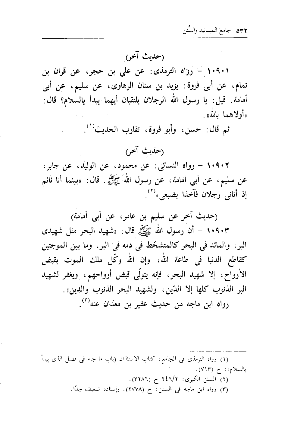 10901 - رواه الترمذى: عن على بن حجر، عن قران بن تمام، عن أبى فروة: يزيد بن سنان الرهاوى، عن سليم، عن أبى أمامة. قيل: يا رسول الله الرجلان يلتقيان أيهما يبدأ بالسلام؟ قال: «أولاهما بالله» .