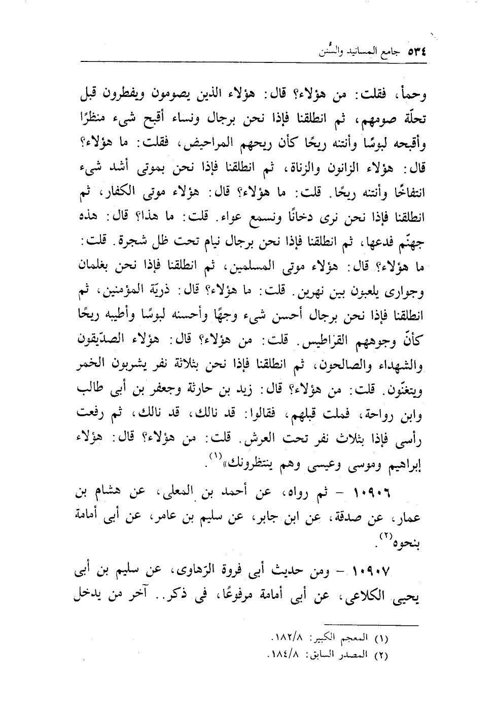 وحمأ، فقلت: من هؤلاء؟ قال: هؤلاء الذين يصومون ويفطرون قبل تحلة صومهم، ثم انطلقنا فإذا نحن برجال ونساء أقبح شىء منظراً وأقبحه لبوساً وأنته ريحاً كأن ريحهم المراحيض، فقلت: ما هؤلاء؟ قال: هؤلاء الزانون والزناة، ثم انطلقنا فإذا نحن بموتى أشد شىء انتفاخاً وأنتنه ريحاً. قلت: ما هؤلاء؟ قال: هؤلاء موتى الكفار، ثم انطلقنا فإذا نحن نرى دخاناً ونسمع عواء. قلت: ما هذا؟ قال: هذه جهنم فدعها، ثم انطلقنا فإذا نحن برجال نيام تحت ظل شجرة. قلت: ما هؤلاء؟ قال: هؤلاء موتى المسلمين، ثم انطلقنا فإذا نحن بغلمان وجوارى يلعبون بين نهرين. قلت: ما هؤلاء؟ قال: ذرية المؤمنين، ثم انطلقنا فإذا نحن برجال أحسن شىء وجهاً وأحسنه لبوساً وأطيبه ريحاً كأن وجوههم القراطيس.