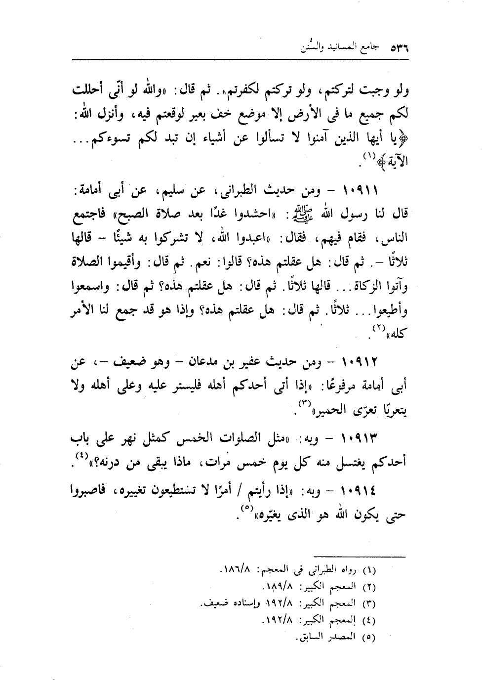10911 - ومن حديث الطبرانى، عن سليم، عن أبى أمامة: قال لنا رسول الله - صلى الله عليه وسلم -: «احشدوا غداً بعد صلاة الصبح» فاجتمع الناس، فقام فيهم، فقال: «اعبدوا الله، لا تشركوا به شيئاً ـ قالها ثلاثاً ـ. ثم قال: هل عقلتم هذه؟ قالوا: نعم. ثم قال: وأقيموا الصلاة وآتوا الزكاة.. قالها ثلاثاً. ثم قال: هل عقلتم هذه؟ ثم قال: واسمعوا وأطيعوا.. ثلاثاً. ثم قال: هل عقلتم هذه؟ وإذا هو قد جمع لنا الأمر كله» (¬1) .