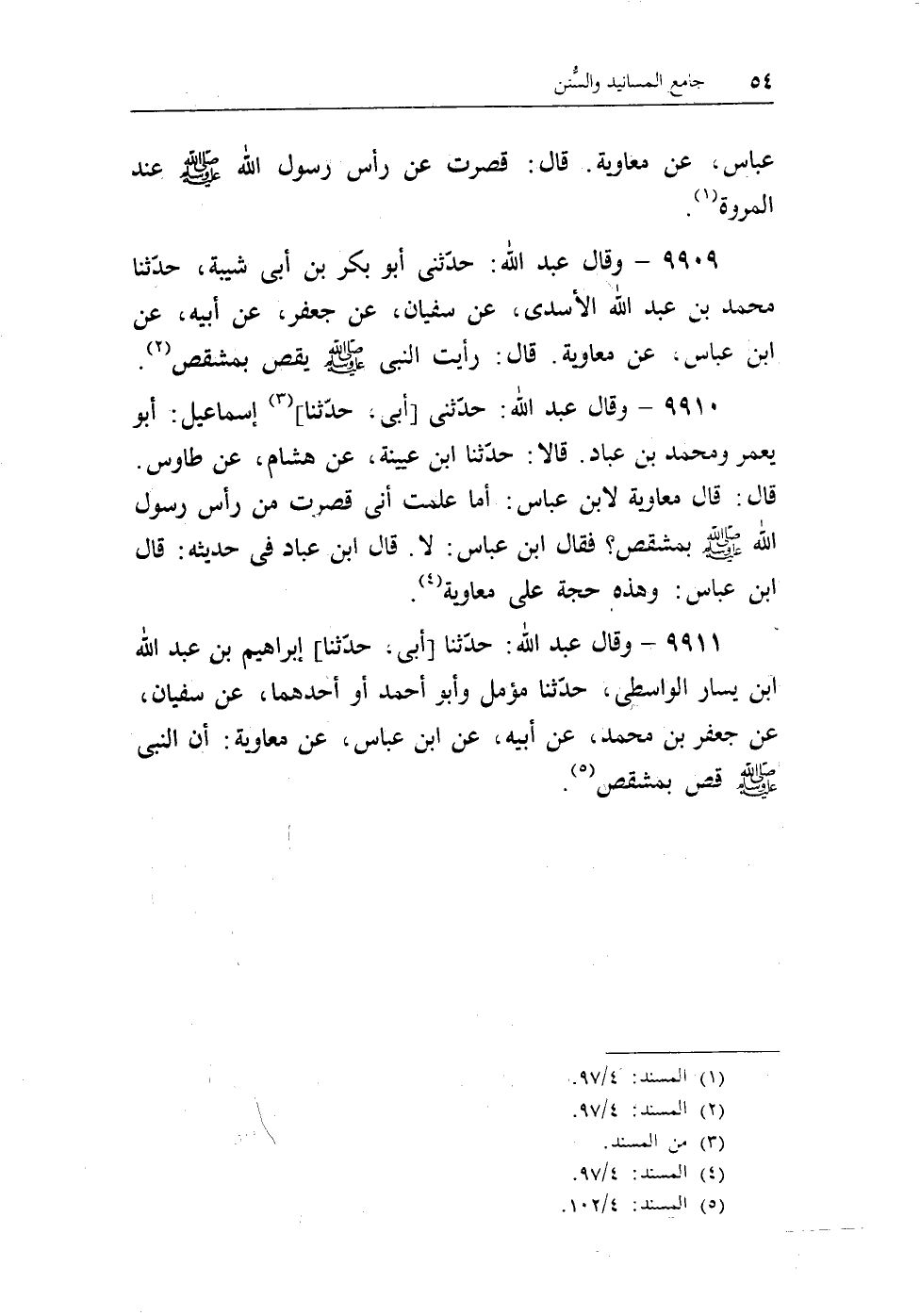 9910 - وقال عبد الله: حدثنى [أبى، حدثنا] (¬2) إسماعيل: أبو يعمر ومحمد ابن عباد. قالا: حدثنا ابن عيينة، عن هشام، عن طاوس. قال: قال معاوية لابن عباس: أما علمت أنى قصرت من رأس رسول الله - صلى الله عليه وسلم - بمشقص؟ فقال ابن عباس: لا. قال ابن عباد فى حديثه: قال ابن عباس: وهذه حجة على معاوية (¬3) .