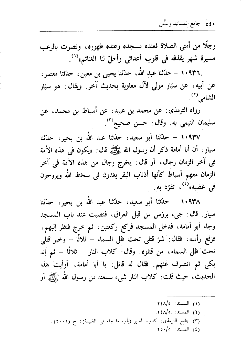 10937 - حدثنا أبو سعيد، حدثنا عبد الله بن بحير، حدثنا سيار: أن أبا أمامة ذكر أن رسول الله - صلى الله عليه وسلم - قال: «يكون فى هذه الأمة فى آخر الزمان رجال، أو قال: يخرج رجال من هذه الأمة فى آخر الزمان معهم أسياط كأنها أذناب البقر يغدون فى سخط الله ويروحون فى غضبه» (¬3) ، تفرد به.