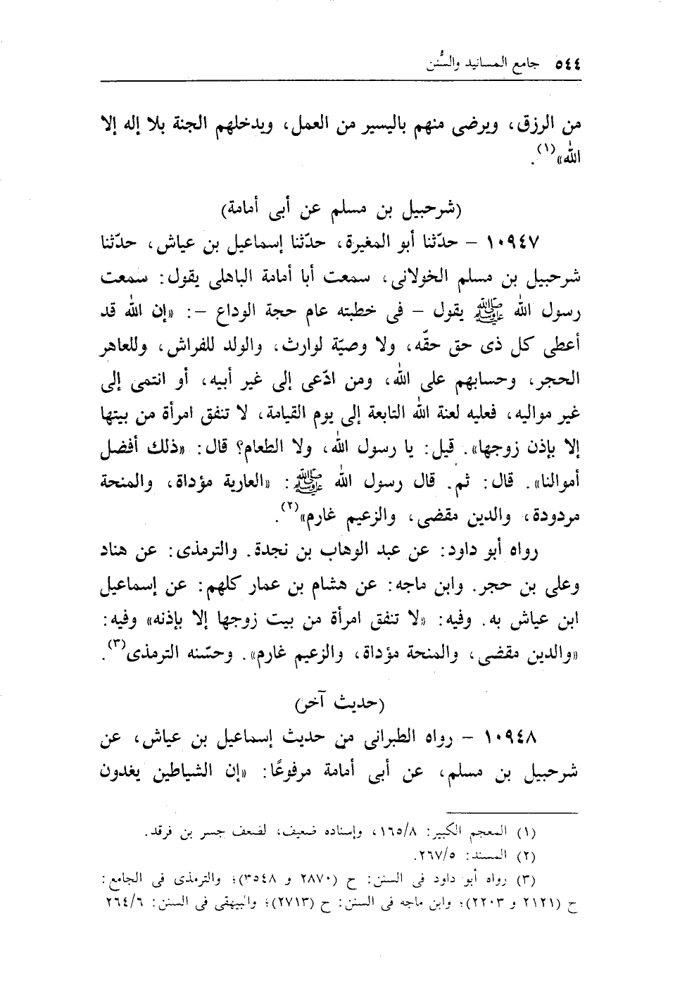 10947 - حدثنا أبو المغيرة، حدثنا إسماعيل بن عياش، حدثنا شرحبيل بن مسلم الخولانى، سمعت أبا أمامة الباهلى يقول: سمعت رسول الله - صلى الله عليه وسلم - يقول ـ فى خطبته عام حجة الوداع ـ: «إن الله قد أعطى كل ذى حق حقه، ولا وصية لوارث، والولد للفراش، وللعاثر الحجر، وحسابهم على الله، ومن ادعى إلى غير أبيه، أو انتمى إلى غير مواليه، فعليه لعنة الله التابعة إلى يوم القيامة، لا تنفق امرأة من بيتها إلا بإذن زوجها» . قيل: يا رسول الله، ولا الطعام؟ قال: «ذلك أفضل أموالنا» . قال: ثم. قال رسول الله - صلى الله عليه وسلم -: «العارية مؤداة، والمنحة مردودة، والدين مقضى، والزعيم غارم» (¬1) .