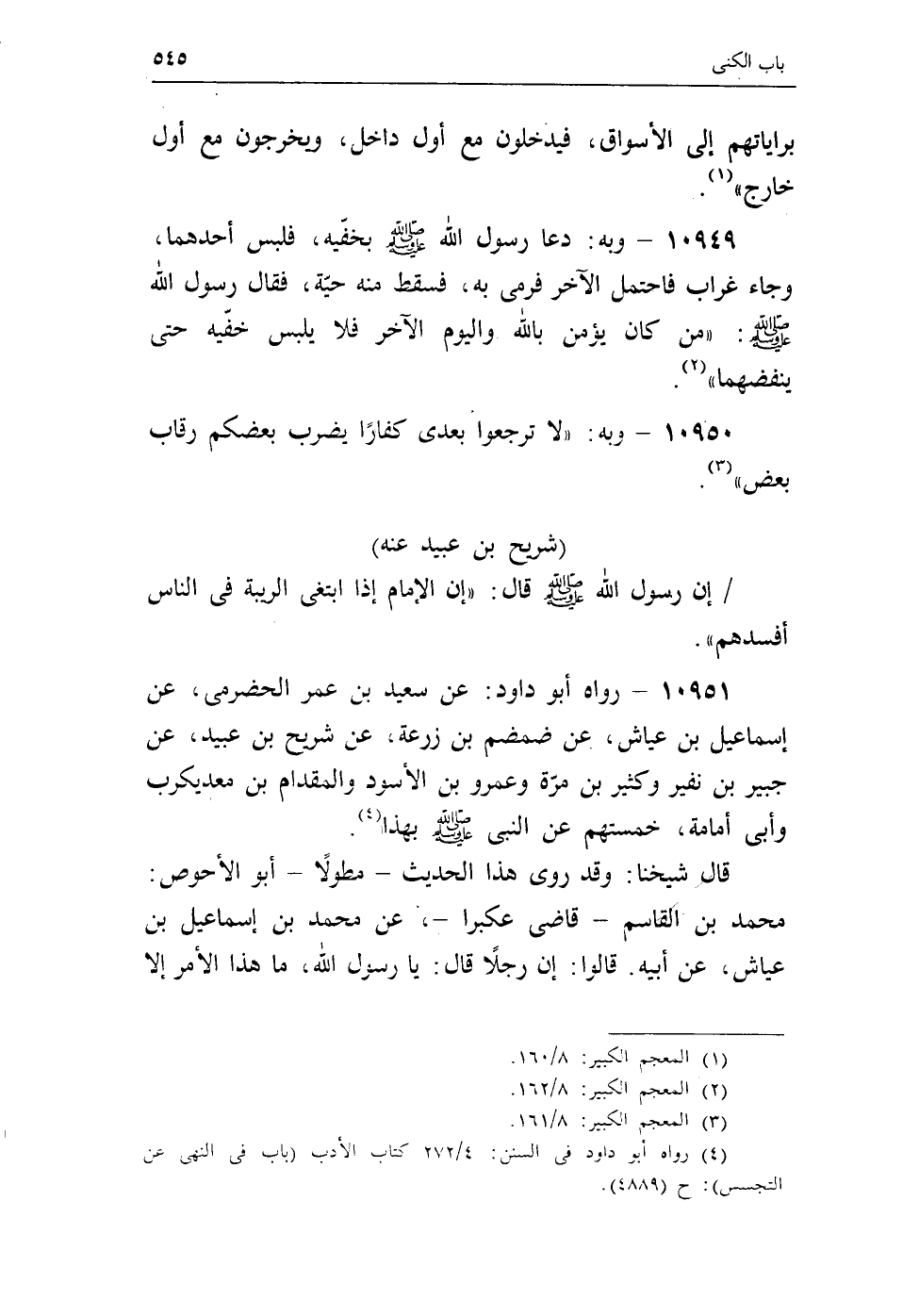 10951 - رواه أبو داود: عن سعيد بن عمر الحضرمى، عن إسماعيل بن عياش، عن ضمضم بن زرعة، عن شريح بن عبيد، عن جبير بن نفير وكثير بن مرة وعمرو بن الأسود والمقدام بن معد يكرب وأبى أمامة خمستهم عن النبى - صلى الله عليه وسلم - بهذا (¬3) .