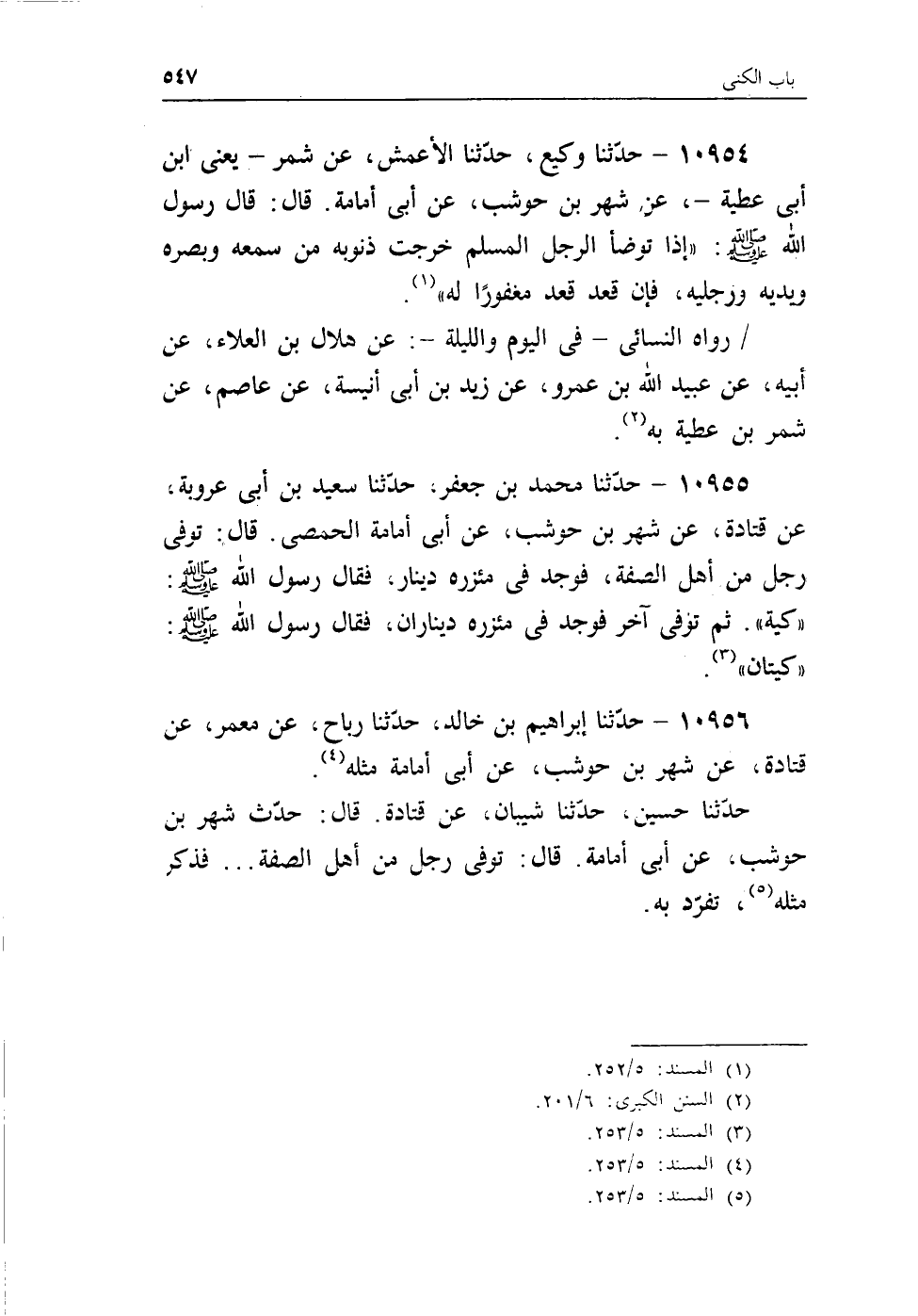 10954 - حدثنا وكيع، حدثنا الاعمش، عن شمر ـ يعنى ابن أبى عطية-، عن شهر بن حوشب، عن أبى أمامة. قال: قال رسول الله - صلى الله عليه وسلم -: «إذا توضأ الرجل المسلم خرجت ذنوبه من سمعه وبصره ويديه ورجليه، فإن قعد قعد مغفوراً له» (¬1) .