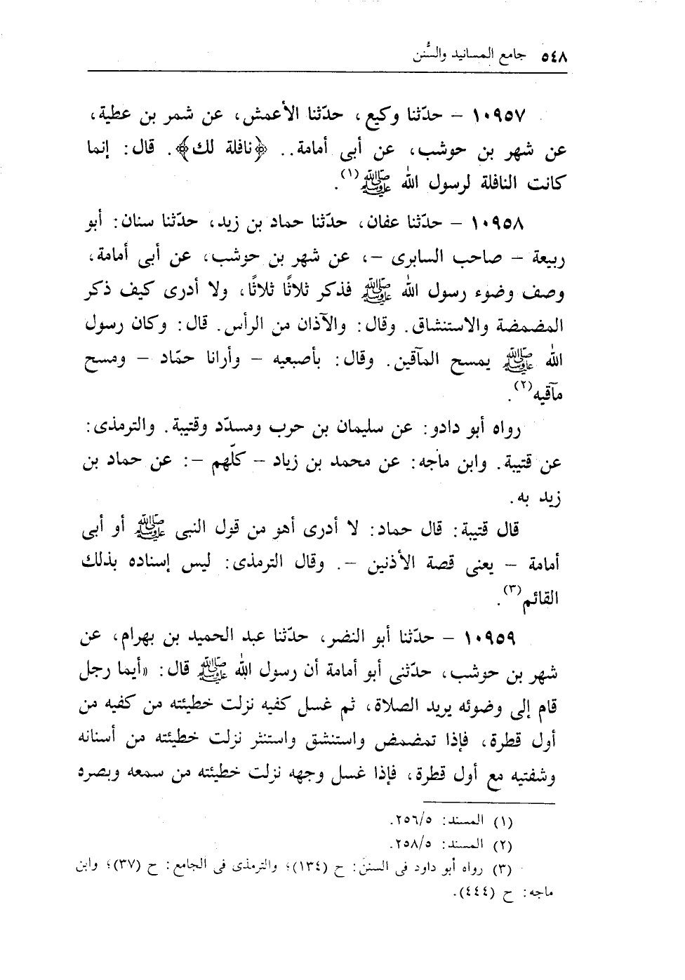 10958 - حدثنا عفان، حدثنا حماد بن زيد، حدثنا سنان: أبو ربيعة ـ صحب السابرى ـ، عن شهر بن حوشب، عن أبى أمامة، وصف وضوء رسول الله - صلى الله عليه وسلم - فذكر ثلاثاً، ولا أدرى كيف ذكر المضمضة والاستنشاق. وقال: والآذان من الرأس. قال: وكان رسول الله - صلى الله عليه وسلم - يمسح المآقين. وقال: بأصبعيه ـ وأرانا حماد ـ ومسح مآقيه (¬2) .