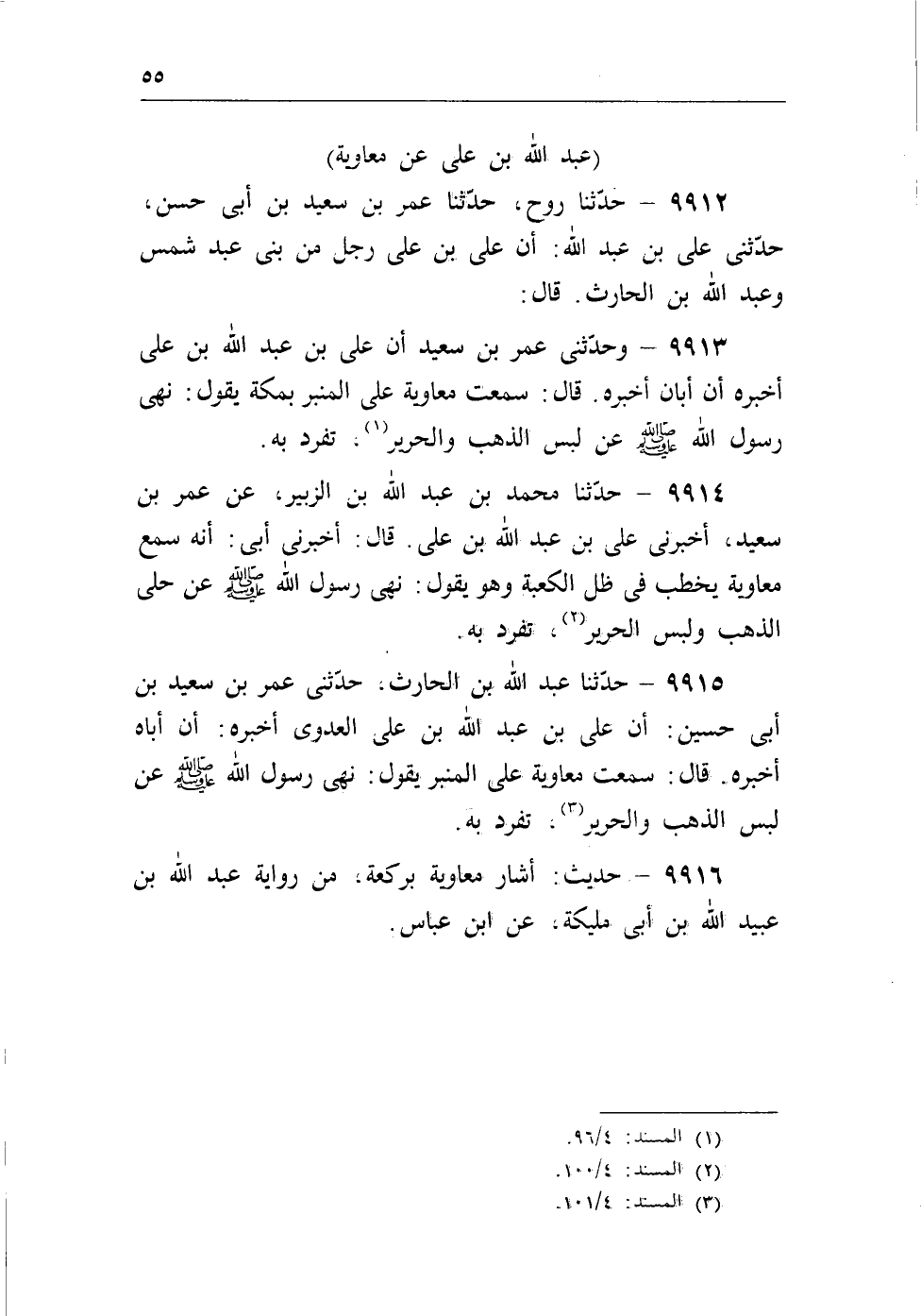 9915 - حدثنا عبد الله بن الحارث، حدثنى عمر بن سعيد بن أبى حسين: أن على بن عبد الله بن على العدوى أخبره: أن أباه أخبره. قال: سمعت معاوية على المنبر يقول: نهى رسول الله - صلى الله عليه وسلم - عن لبس الذهب والحرير (¬3) ، تفرد به.