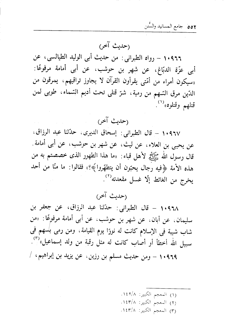 10968 - قال الطبرانى: حدثنا عبد الرزاق، عن جعفر بن سليمان، عن أبان، عن شهر بن حوشب، عن أبى أمامة مرفوعاً: «من شاب شيبة فى الإسلام كانت له نوراً يوم القيامة، ومن رمى بسهم فى سبيل الله أخطأ أو أصاب كانت له مثل رقبة من ولد إسماعيل» (¬3) .