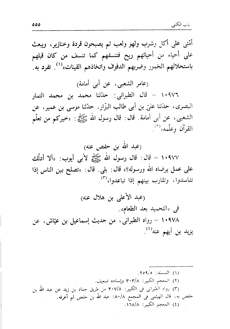 (¬2) رواه الطبرانى فى الكبير: 8/307 من طريق حماد بن زيد عن عبد الله بن حفص به، قال الهيثمى فى المجمع 8/80: عبد الله بن حفص لم أعرفه.