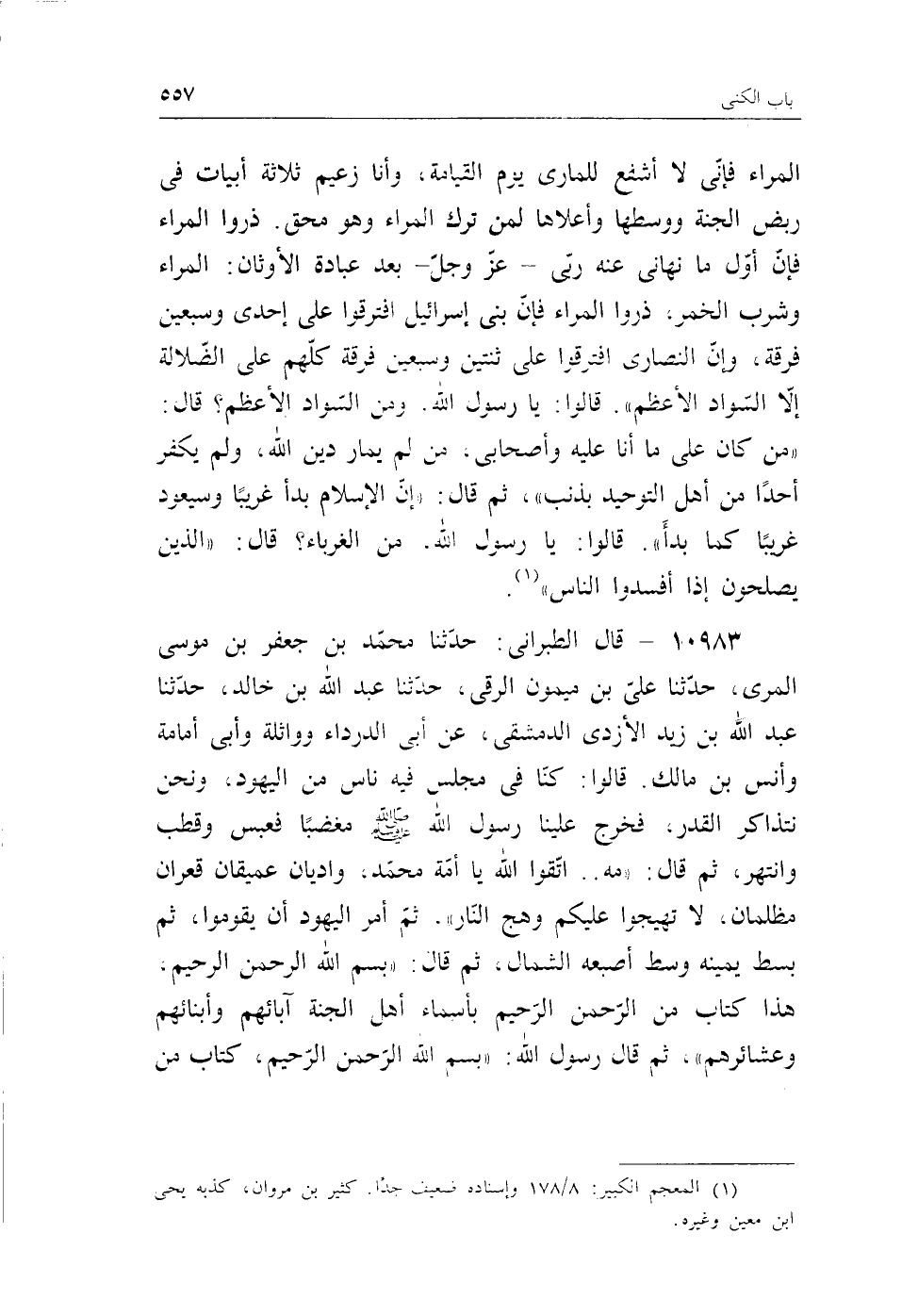 10983 - قال الطبرانى: حدثنا محمد بن جعفر بن موسى المرى، حدثنا على ابن ميمون الرقى، حدثنا عبد الله بن خالد، حدثنا عبد الله بن زيد الأزدى الدمشقى، عن أبى الدرداء وواثلة وأبى أمامة وأنس بن مالك. قالوا: كنا فى مجلس فيه ناس من اليهود، ونحن نتذاكر القدر، فخرج علينا رسول الله - صلى الله عليه وسلم - مغضباً فعبس وقطب وانتهر، ثم قال: «مه.. اتقوا الله يا أمة محمد، واديان عميقان قعران مظلمان، لا تهيجوا عليكم وهج النار» . ثم أمر اليهود أن يقوموا، ثم بسط يمينه وسط أصبعه الشمال، ثم قال: «بسم الله الرحمن الرحيم، هذا كتاب من الرحمن بأسماء أهل الجنة آبائهم وأبنائهم وعشائرهم» ، ثم قال رسول الله: «بسم الله الرحمن الرحيم، كتاب من