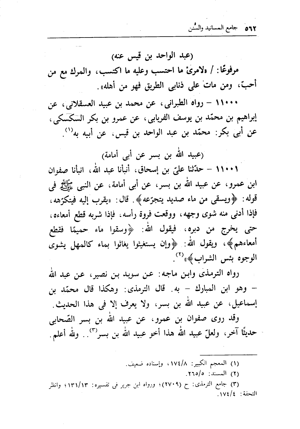11001 - حدثنا على بن إسحاق، أنبأنا عبد الله، أنبأنا صفوان بن عمرو، عن عبيد الله بن بسر، عن أبى أمامة، عن النبى - صلى الله عليه وسلم - فى قوله: {وَيُسقَى مِنْ مَاءٍ صَدِيدٍ يَتَجَرَعَهُ} . قال: «يقرب إليه فيتكرهه، فإذا أدنى منه شوى وجهه، ووفعت فروة رأسه، فإذا شربه قطع أمعاءه، حتى يخرج من دبره، فيقول الله: {وَسُقُوا مَاءً حَمِيمَاً فَقَطَعَ أَمْعَاءَهُم} ، ويقول الله: {وَإِنْ يَسْتَغِيثُوا يُغَاثُوا بِمَاءٍ كَالمُهْلِ يَشْوِى الوُجُوه بِئسَ الشَرَابُ} » (¬2) .