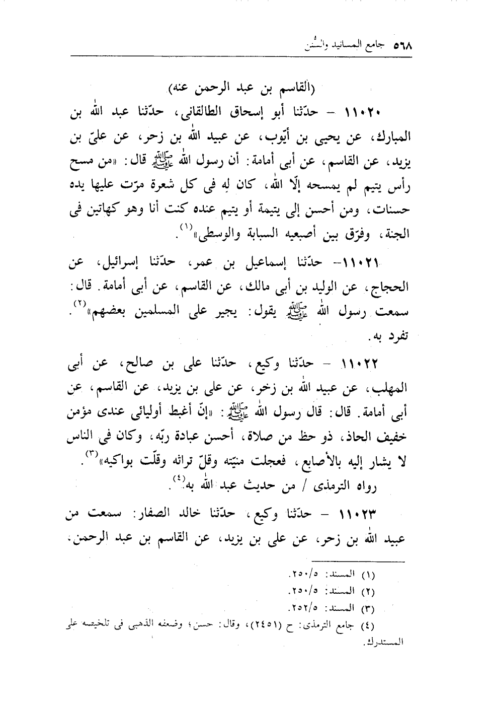 11020 - حدثنا أبو إسحاق الطالقانى، حدثنا عبد الله بن المبارك، عن يحيى ابن أيوب، عن عبيد الله بن زحر، عن على بن يزيد، عن القاسم، عن أبى أمامة: أن رسول الله - صلى الله عليه وسلم - قال: «من مسح رأس يتيم لم يمسحه إلا الله، كان له فى كل شعرة مرت عليها يده حسنات، ومن أحسن إلى يتيمة أو يتيم عنده كنت أنا وهو كهاتين فى الجنة، وفرق بين أصبعيه السبابة والوسطى» (¬1) .