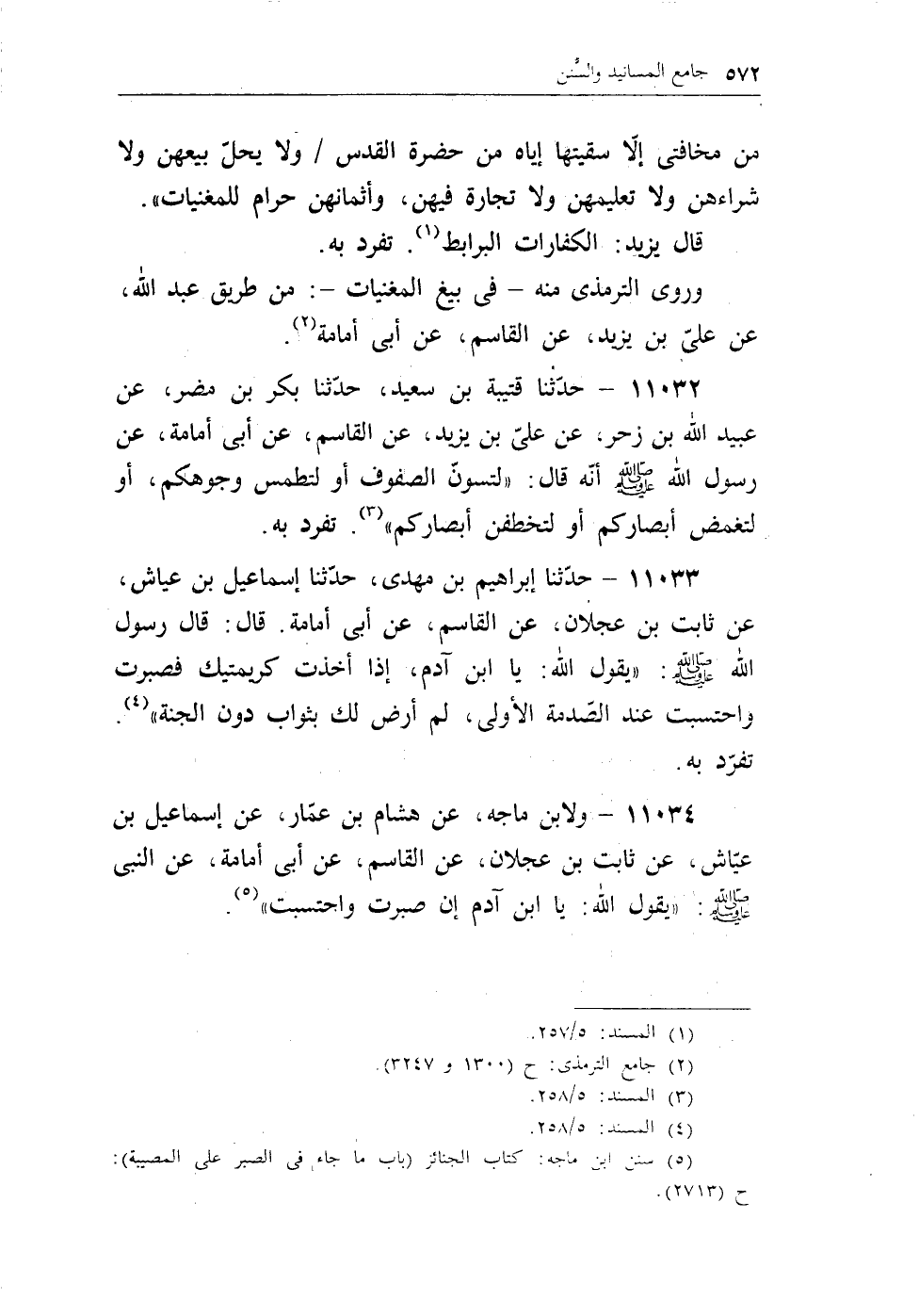وروى الترمذى منه ـ فى بيع المغنيات ـ: من طريق عبد الله، عن على بن يزيد، عن القاسم، عن أبى أمامة (¬2) .
