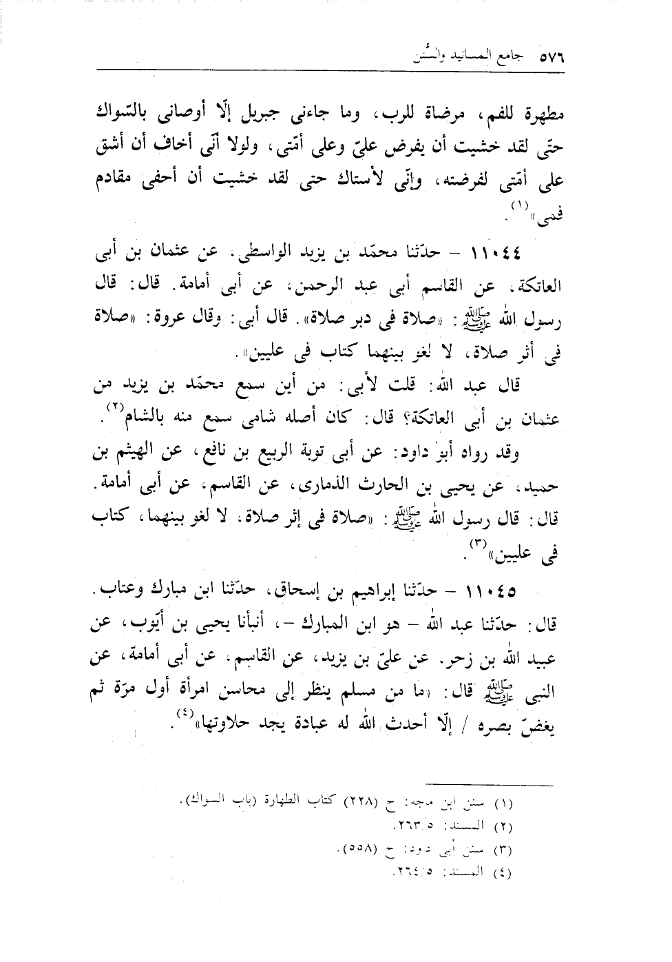 11044 - حدثنا محمد بن يزيد الواسطى، عن عثمان بن أبى العاتكة، عن القاسم أبى عبد الرحمن، عن أبى أمامة. قال: قال رسول الله - صلى الله عليه وسلم -: «صلاة فى دبر صلاة» . قال أبى: وقال عروة: «صلاة فى أثر صلاة، لا لغز بينهما كتاب فى عليين» .