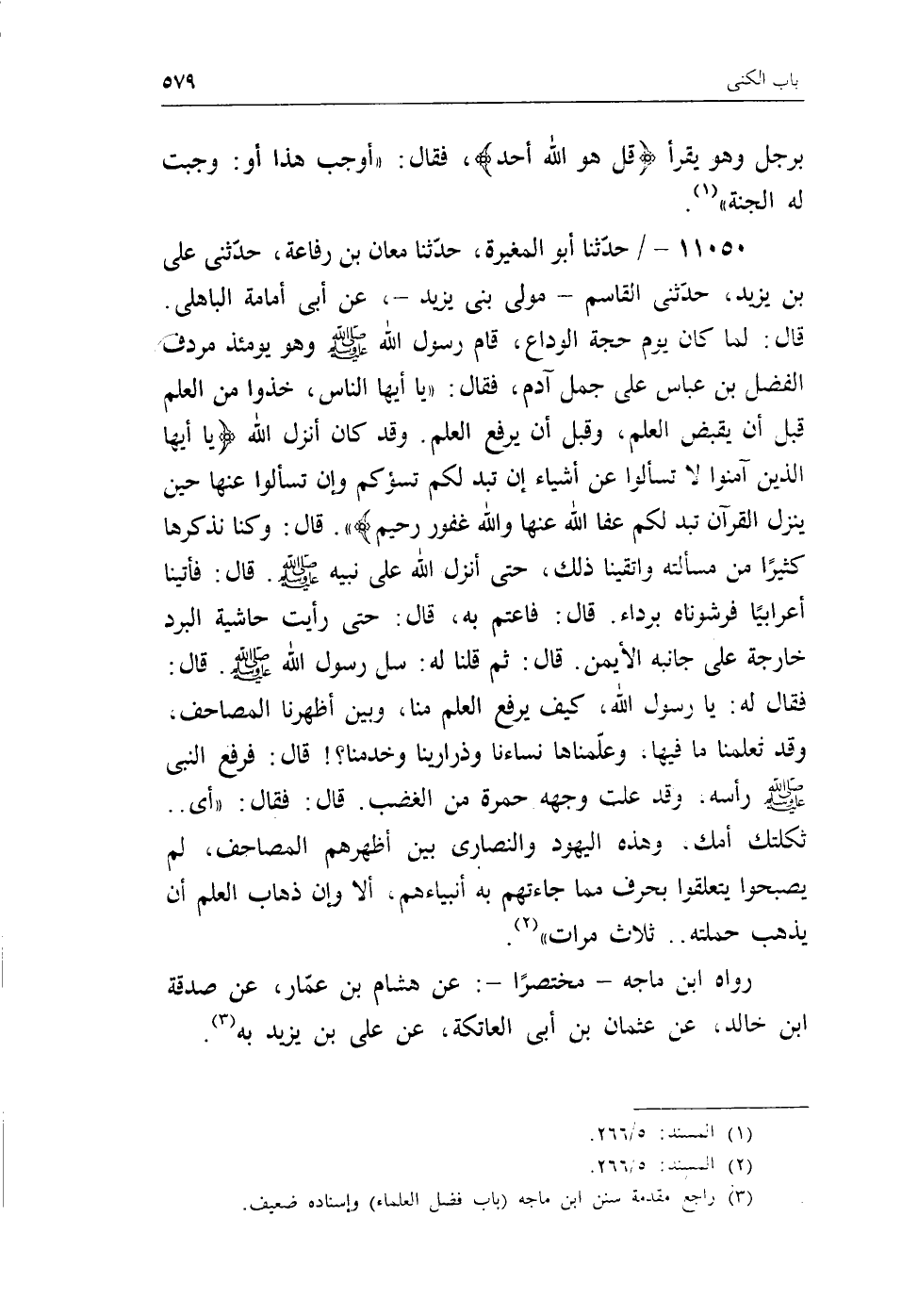 11050 - / حدثنا أبو المغيرة، حدثنا معان بن رفاعة، حدثنى على بن يزيد، حدثنى القاسم ـ مولى بن يزيد ـ، عن أبى أمامة الباهلى. قال: لما كان يوم حجة الوداع، قام رسول الله - صلى الله عليه وسلم - وهو يومئذ مردف الفضل بن عباس على جمل آدم، فقال: «يا أيها الناس، خذوا من العلم قبل أن يقبض العلم، وقبل أن يرفع العلم. وقد كان أنزل الله {يَا أَيُّهَا الَّذِينَ آمَنُوا لا تَسْأَلوا عَنْ أَشْيَاءَ إِنْ تُبْدَ لَكُمْ تَسُؤْكُمْ وَإِنْ تَسْأَلوا عَنْهَا حِينَ يُنَزَّلُ الْقُرْآنُ تُبْدَ لَكُمْ عَفَا اللَّهُ عَنْهَا وَاللَّهُ غَفُورٌ حَلِيمٌ} » . قال: وكنا نذكرها كثيراً من مسألته واتقينا ذلك، حتى أنزل الله على نبيه - صلى الله عليه وسلم -. قال: فأتينا أعرابياً فرشوناه برداء. قال: فاعتم به، قال: حتى رأيت حاشية البرد خارجة على جانبه الأيمن. قال: ثم قلنا له: سل رسول الله - صلى الله عليه وسلم -. قال: فقال له: يا رسول الله، كيف يرفع العلم منا، وبين أظهرنا المصاحف، وقد تعلمنا ما فيها، وعلمناها نساءنا وذرارينا وخدمنا؟ ! قال: فرفع النبى - صلى الله عليه وسلم - رأسه. وقد علت وجهه حمرة من الغضب. قال: فقال: «أى.. ثكلتك أمك، وهذه اليهود والنصارى بين أظهرهم المصاحف، لم يصبحوا يتعلقوا بحرف مما جاءتهم به أنبياءهم، ألا وإن ذهاب العلم أن يذهب حملته.. ثلاث مرات» (¬1) .
