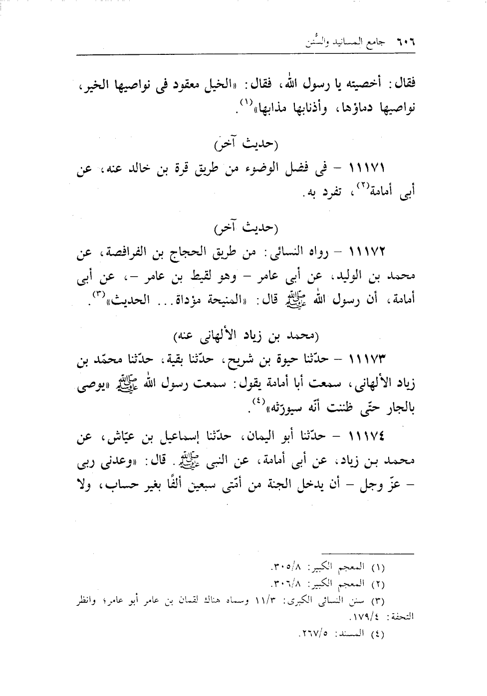 11173 - حدثنا حيوة بن شريح، حدثنا بقية، حدثنا محمد بن زياد الألهانى، سمعت أبا أمامة يقول: سمعت رسول الله - صلى الله عليه وسلم - «يوصى بالجار حتى ظننت أنه سيورثه» (¬3) .