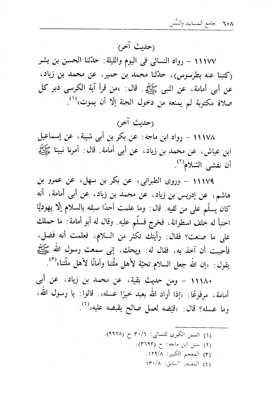 11177 - رواه النسائى فى اليوم والليلة: حدثنا الحسن بن بشير (كتبنا عنه بطرسوس) ، حدثنا محمد بن حمير، عن محمد بن زياد، عن أبى أمامة، عن النبى - صلى الله عليه وسلم -. قال: «من قرأ آية الكرسى دبر كل صلاة مكتوبة لم يمنعه من دخول الجنة إلا أن يموت» (¬1) .