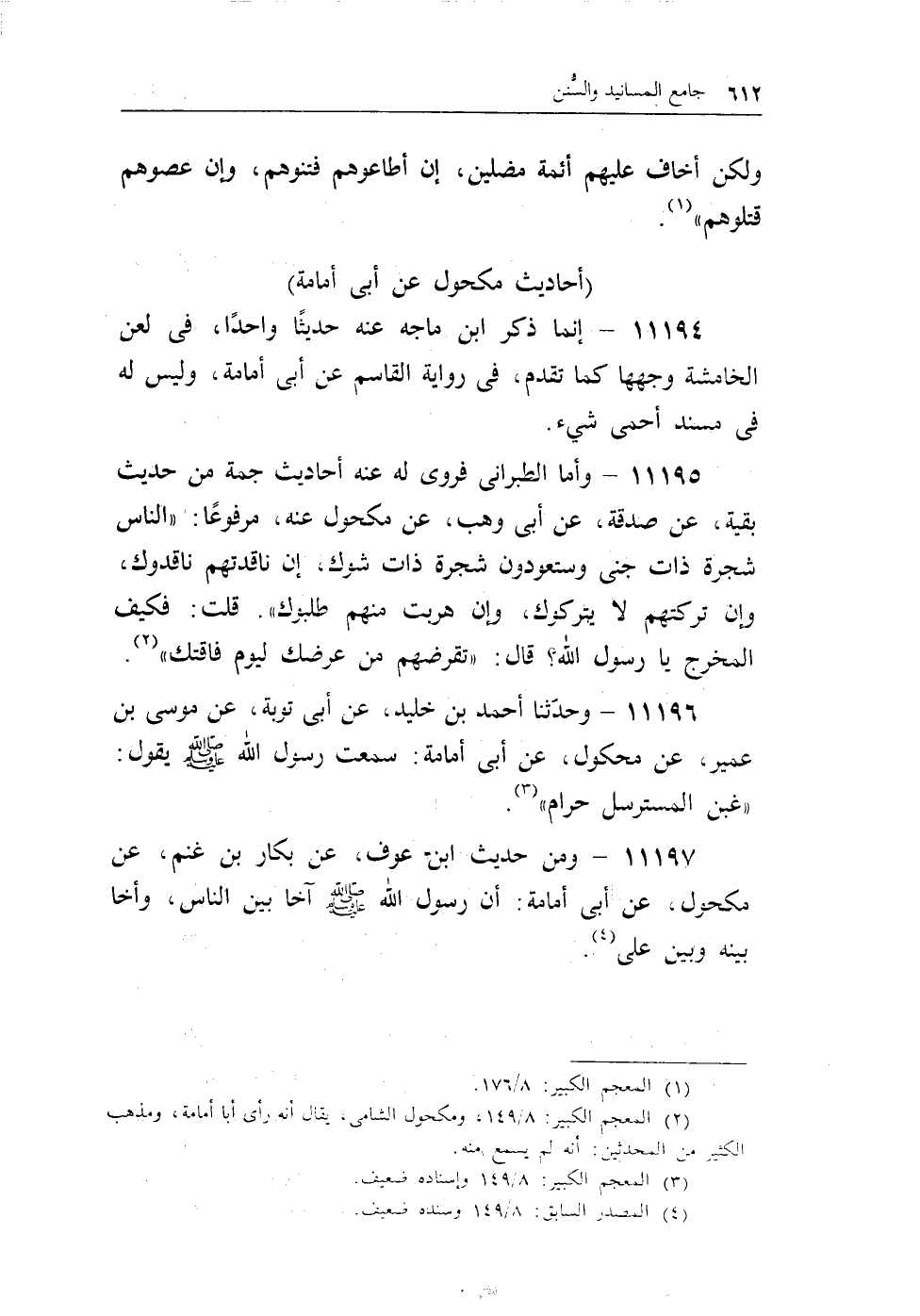 (¬1) المعجم الكبير: 8/149، ومكحول الشامى، يقال أنه رأى أبا أمامة، ومذهب الكثير من المحدثين: أنه لم يسمع منه.