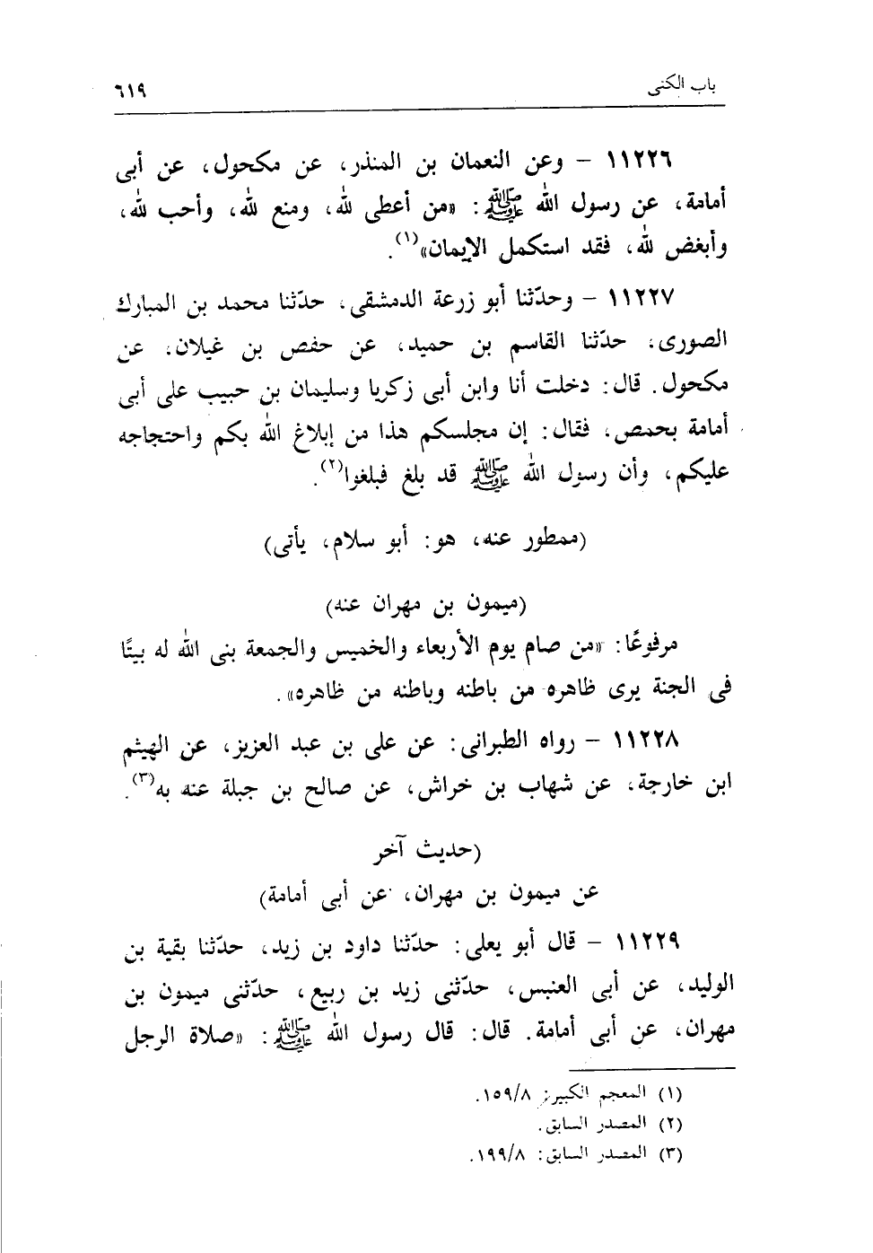 11226 - وعن النعمان بن المنذر، عن مكحول، عن أبى أمامة، عن رسول الله - صلى الله عليه وسلم -: «من أعطى لله، ومنع لله، وأحب لله، وأبغض لله، فقد استكمل الإيمان» (¬1) .