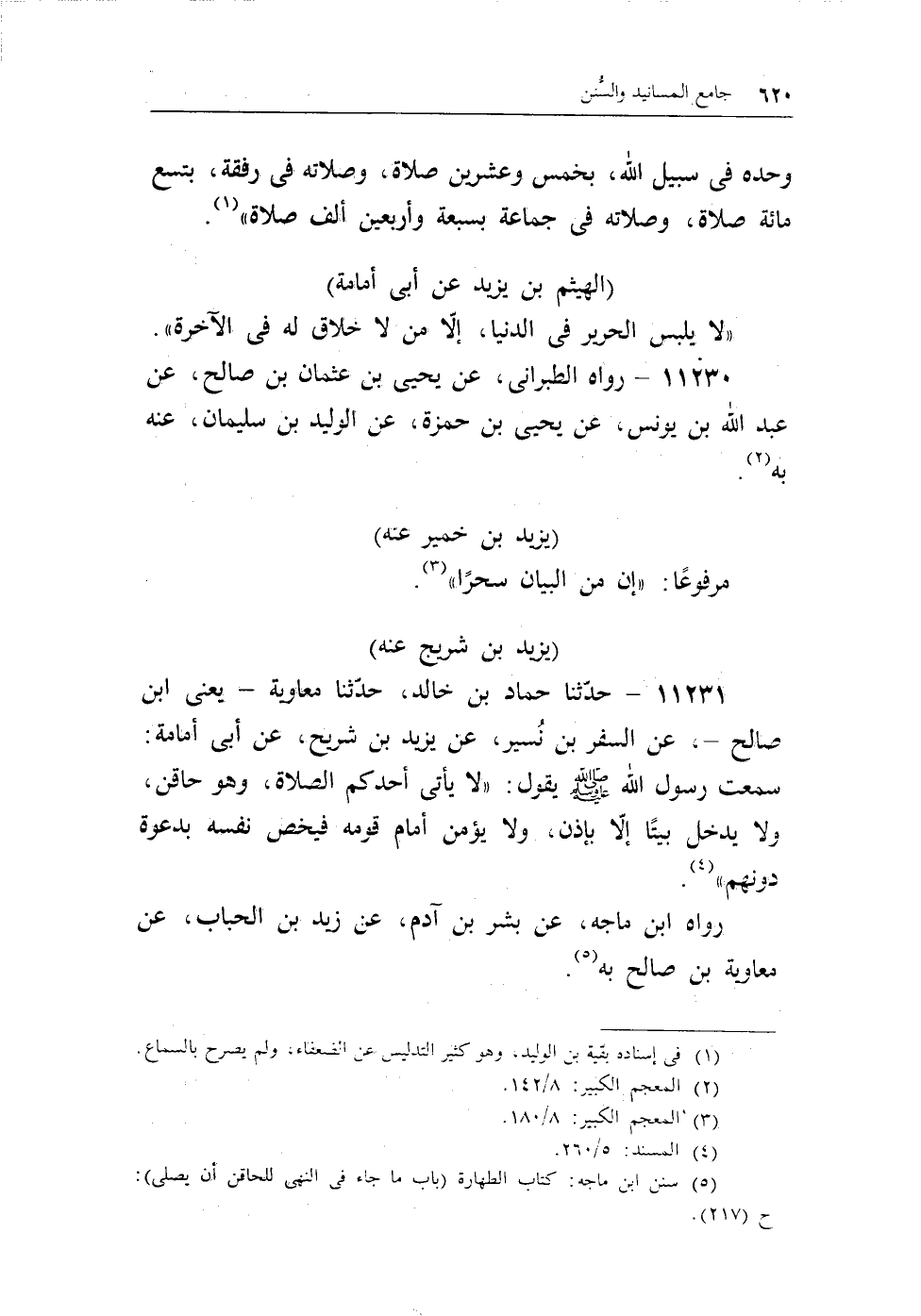 11231 - حدثنا حماد بن خالد، حدثنا معاوية ـ يعنى ابن صالح ـ، عن السفر بن نسير، عن يزيد بن شريح، عن أبى أمامة: سمعت رسول الله - صلى الله عليه وسلم - يقول: «لا يأتى أحدكم الصلاة، وهو حاقن، ولا يدخل بيتاً إلا بإذن، ولا يؤمن أمام قومه فيخص نفسه بدعوة دونهم» (¬3) .