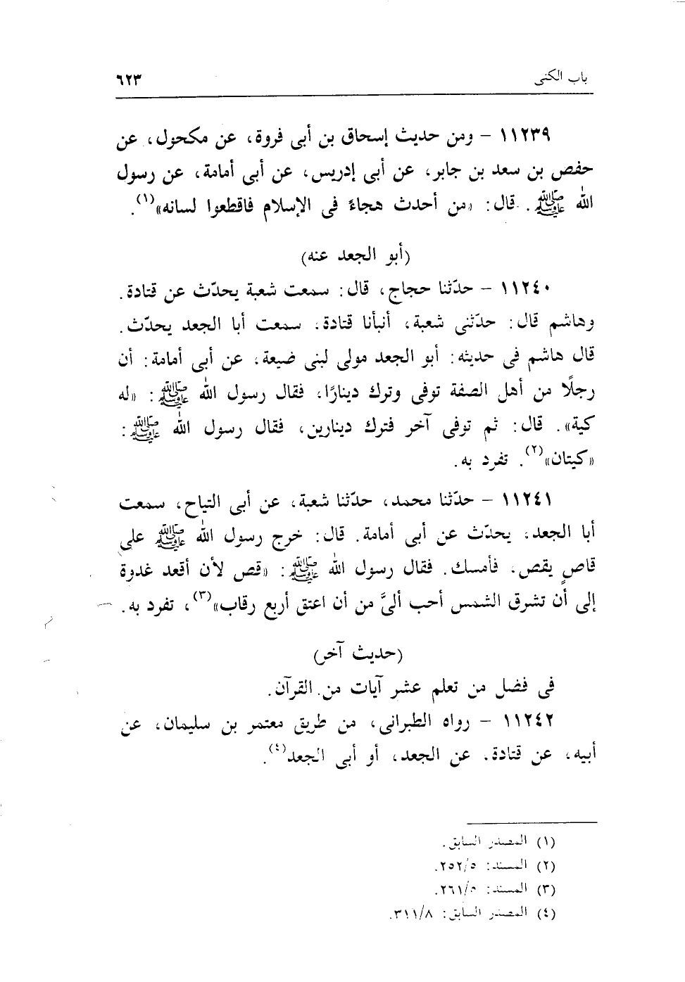 11240 - حدثنا حجاج، قال: سمعت شعبة يحدث عن قتادة. وهاشم قال: حدثنى شعبة، أنبأنا قتادة، سمعت أبا الجعد يحدث. قال هاشم فى حديثه: أبو الجعد مولى لنبى ضيعة، عن أبى أمامة: أن رجلاً من أهل الصفة توفى وترك ديناراً، فقال رسول الله - صلى الله عليه وسلم -: «له كية» . قال: ثم توفى آخر فتوك دينارين، فقال رسول الله - صلى الله عليه وسلم -: «كيتان» (¬2) . تفرد به.