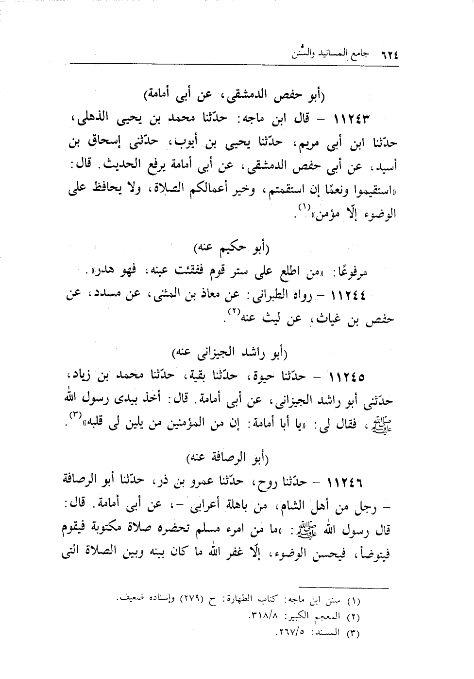 11245 - حدثنا حيوة، حدثنا بقية، حدثنا محمد بن زياد، حدثنى أبو راشد الجيزانى، عن أبى أمامة. قال: أخذ بيدى رسول الله - صلى الله عليه وسلم -، فقال لى: «يا أبا أمامة: إن من المؤمنين من يلين لى قلبه» (¬3) .