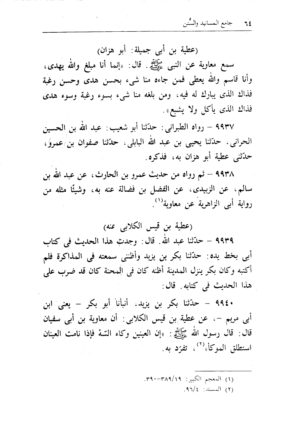 9940 - حدثنا بكر بن يزيد، أنبانا أبو بكر- يعنى ابن أبى مريم-، عن عطية بن قيس الكلابى: أن معاوية بن أبى سفيان قال: قال رسول الله - صلى الله عليه وسلم -: «إن العينين وكاء السه فإذا نامت العينان استطلق الموكأ» (¬2) ، تفرد به.