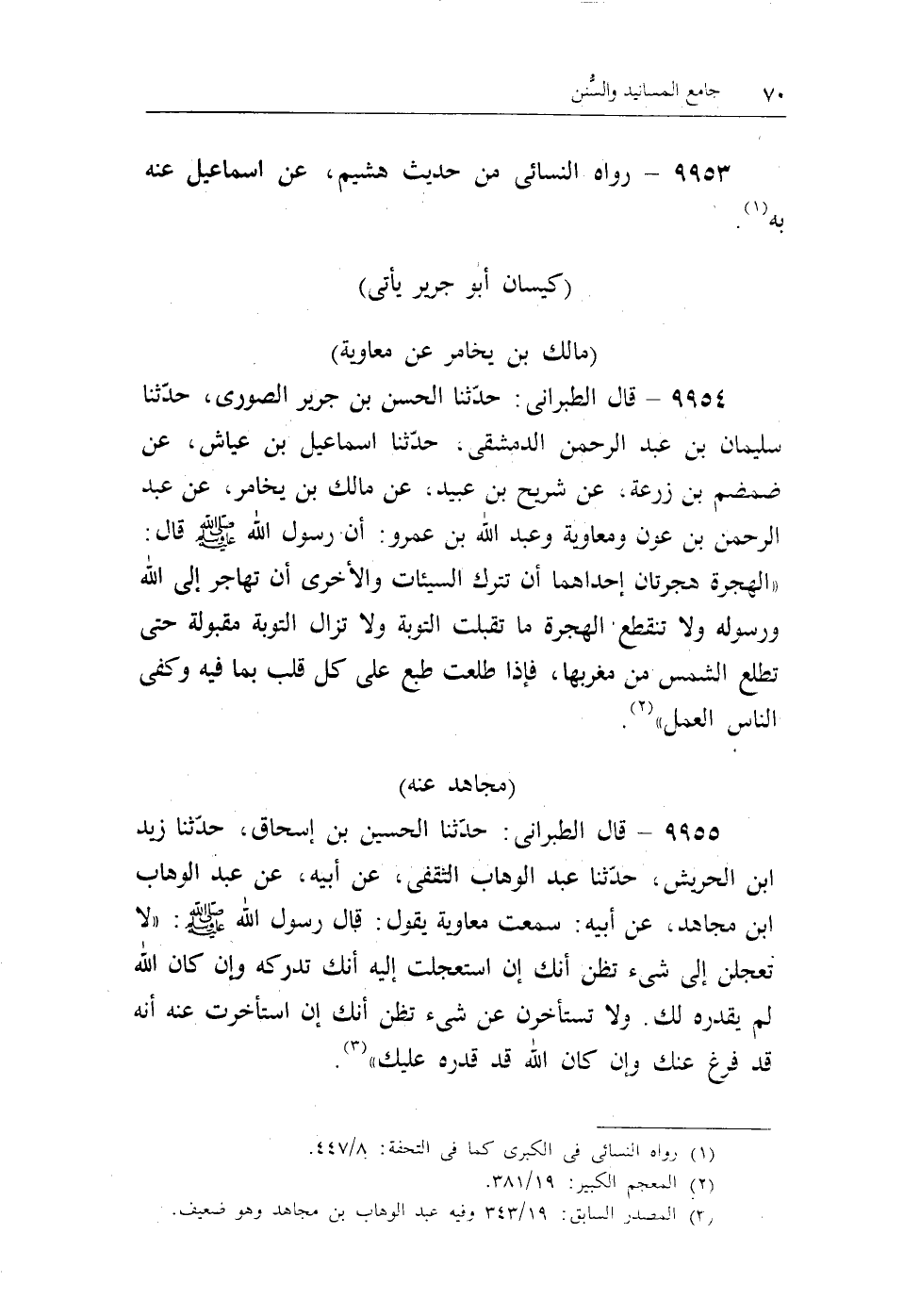 9954 - قال الطبرانى: حدثنا الحسن بن جرير الصورى، حدثنا سليمان بن عبد الرحمن الدمشقى، حدثنا إسماعيل بن عياش، عن ضمضم بن زرعة، عن شريح ابن عبيد، عن ماللط بن يخامر، عن عبد الرحمن بن عون ومعاوية وعبد الله بن عمرو: أن رسول الله - صلى الله عليه وسلم - قال: «الهجرة هجرتان إحداهما أن تترك السيئات والأخرى أن تهاجر إلى الله ورسوله ولا تنقطع الهجرة ما تقبلت التوبة ولا تزال التوبة مقبولة حتى تطلع الشمس من مغربها، فإذا طلعت طبع على كل قلب بما فيه وكفى الناس العمل» (¬2) .