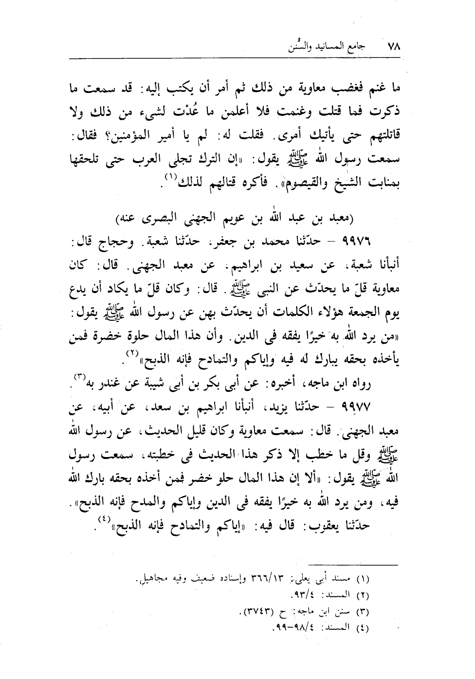 9977 - حدثنا يزيد، أنبأنا إبراهيم بن سعد، عن أبيه، عن معبد الجهنى. قال: سمعت معاوية وكان قليل الحديث، عن رسول الله - صلى الله عليه وسلم - وقل ما خطب إلا ذكر هذا الحديث فى خطبته، سمعت رسول الله - صلى الله عليه وسلم - يقول: «ألا إن هذا المال حلو خضر فمن أخذه بحقه بارك الله فيه، ومن يرد الله به خيرا يفقه فى الدين وإياكم والمدح فإنه الذبح» .