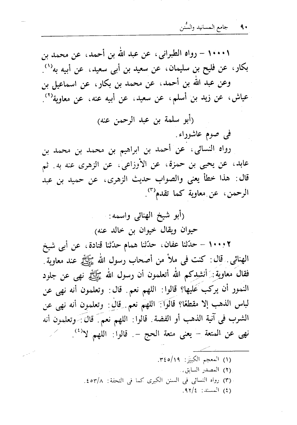 10002 - حدثنا عفان، حدثنا همام حدثنا قتادة، عن أبى ششيخ الهنائى. قال: كنت فى ملأ من أصحاب رسول الله - صلى الله عليه وسلم - عند معاوية. فقال معاوية: أنشدكم الله أتعلمون أن رسول الله - صلى الله عليه وسلم - نهى عن جلود النمور أن يركب عليها؟ قالوا: نهعم. قال: وتعلمون أنه نهى عن لباس الذهب إلا مقطعا؟ قالوا: نعم. قال: وتعلمون أنه نهى عن الشرب فى آنية الذهب أو الفضة. قالوا: نعم. قال: وتعلمون أنه نهى عن المتعة- يعنى متعة الحج-. قالوا: اللهم لا (¬4) .