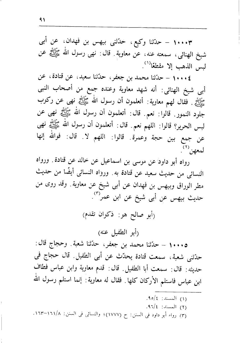 10003 - حدثنا وكيع، حدثن بيهس بن فهدان، عن أبى شيخ الهنائى، سمعته عنه، عن معاوية. قال: نهى رسول الله - صلى الله عليه وسلم - عن لبس الذهب إلا مقطعا (¬1) .