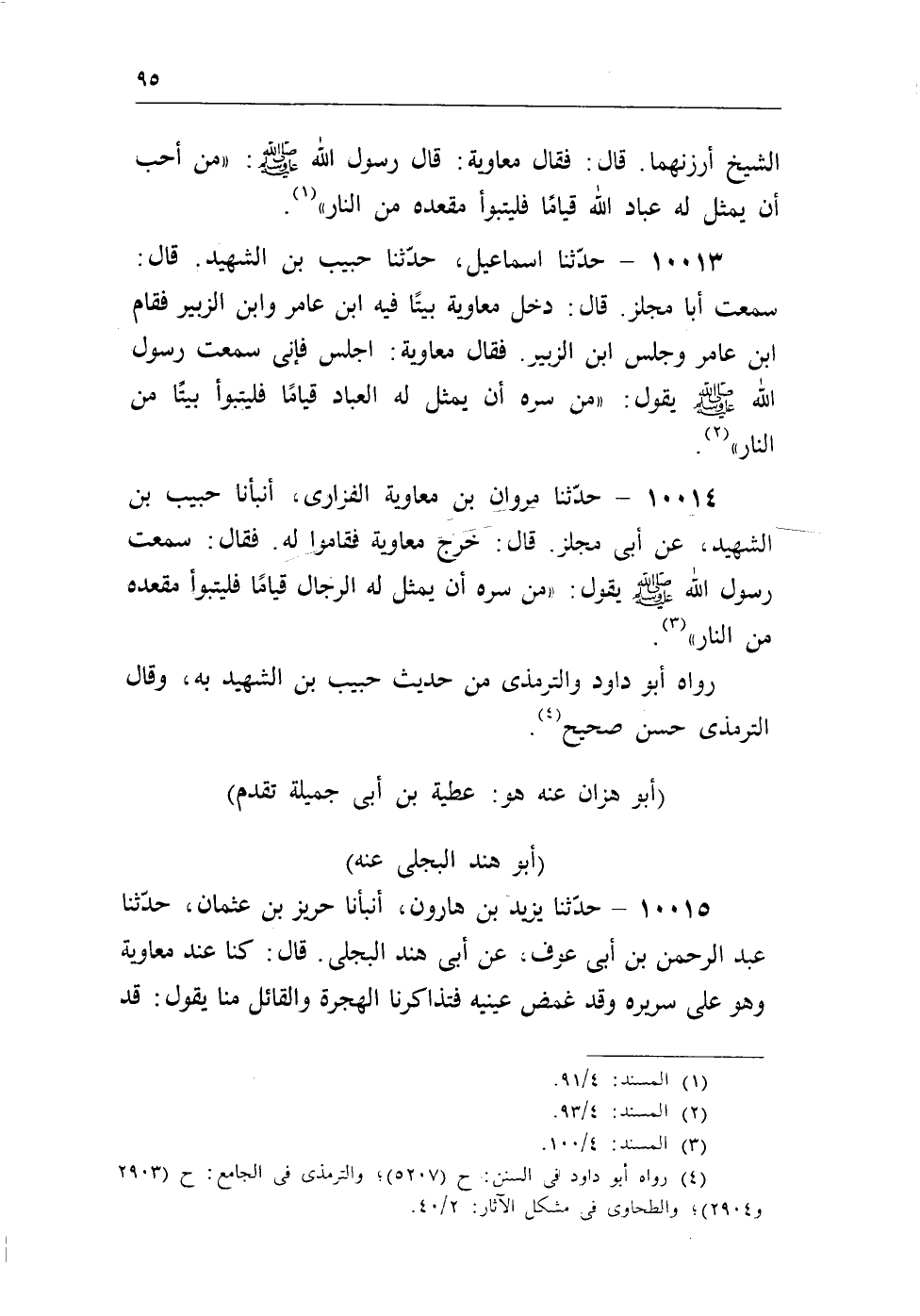 10014 - حدثنا مروان بن معاوية الفزارى، أنبأنا حبيب بن الشهيد، عن أبى مجلز. قال: خرج معاوية فقاموا له. فقال: سمعت رسول الله - صلى الله عليه وسلم - يقول: «من سره أن يمثل له الرجال قياما فليتبوأ مقعده من النار» (¬2) .