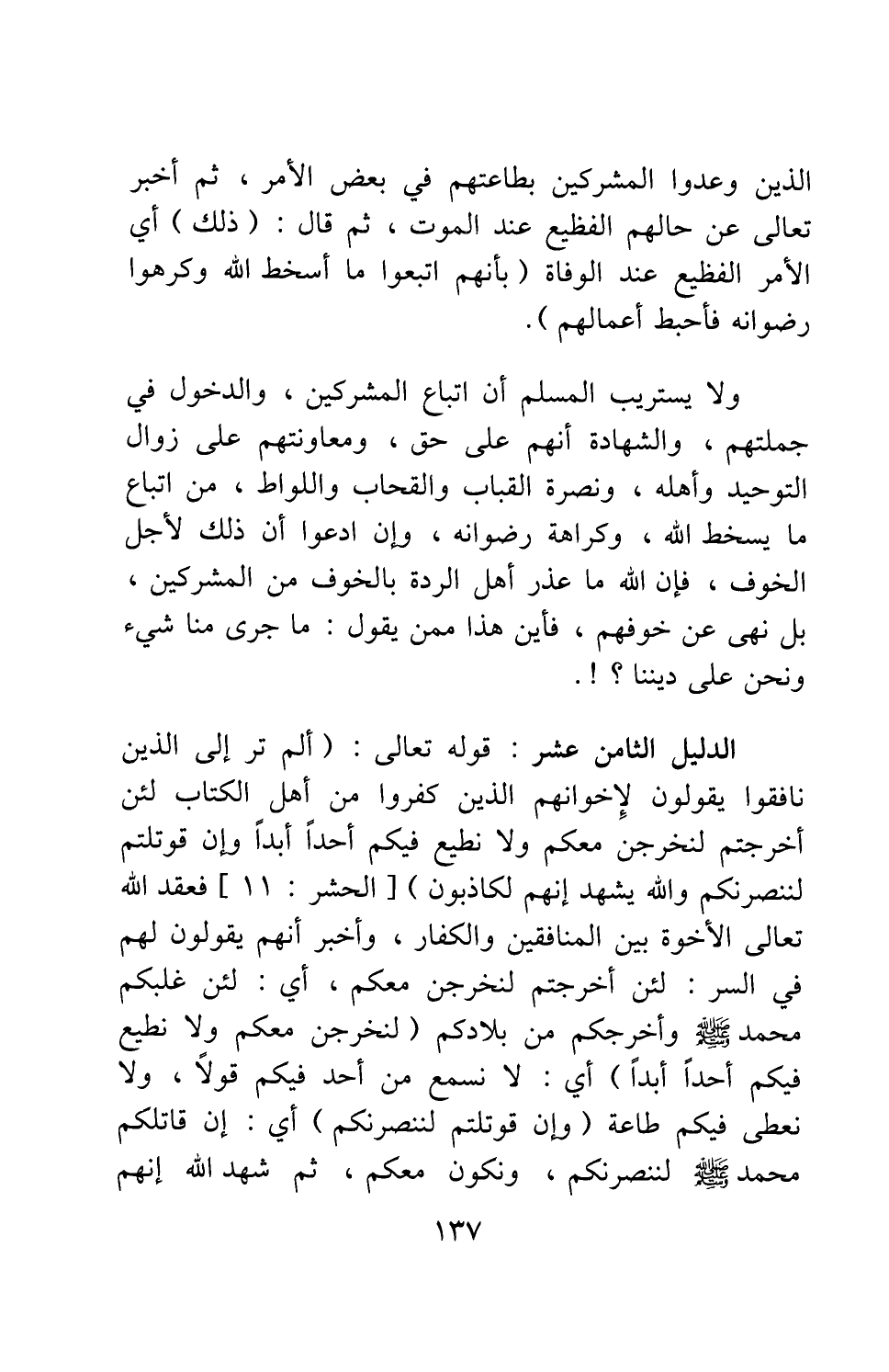 الذين وعدوا المشركين بطاعتهم في بعض الأمر. ثم أخبر تعالى عن حالهم الفظيع عند الموت، ثم قال: {ذَلِكَ} أي: الأمر الفظيع عند الوفاة، {ذَلِكَ بِأَنَّهُمُ اتَّبَعُوا مَا أَسْخَطَ اللَّهَ وَكَرِهُوا رِضْوَانَهُ فَأَحْبَطَ أَعْمَالَهُمْ} [سورة محمد آية: 28] . ولا يستريب المسلم أن اتباع المشركين، والدخول في جملتهم، والشهادة أنهم على حق، ومعاونتهم على زوال التوحيد وأهله، ونصرة القباب والقحاب واللواط، من اتباع ما يسخط الله، وكراهة رضوانه، وإن ادعوا أن ذلك لأجل الخوف؛ فإن الله ما عذر أهل الردة بالخوف من المشركين، بل نهى عن خوفهم. فأين هذا ممن يقول: ما جرى منا شيء ونحن على ديننا؟!