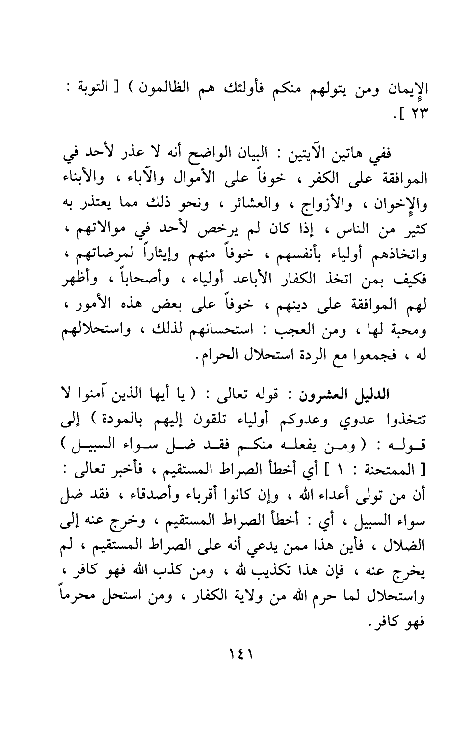 الدليل العشرون: قوله تعالى: {يَا أَيُّهَا الَّذِينَ آمَنُوا لا تَتَّخِذُوا عَدُوِّي وَعَدُوَّكُمْ أَوْلِيَاءَ تُلْقُونَ إِلَيْهِمْ بِالْمَوَدَّةِ} إلى قوله: {وَمَنْ يَفْعَلْهُ مِنْكُمْ فَقَدْ ضَلَّ سَوَاءَ السَّبِيلِ} [سورة الممتحنة آية: 1] أي: أخطأ الصراط المستقيم، فأخبر تعالى: أن من تولى أعداء الله، وإن كانوا أقرباء وأصدقاء، فقد ضل سواء السبيل، أي: أخطأ الصراط المستقيم، وخرج عنه إلى الضلال؛ فأين هذا ممن يدعي أنه على الصراط المستقيم، لم يخرج عنه؟ فإن هذا تكذيب لله، ومن كذب الله فهو كافر، واستحلال لما حرم الله من ولاية الكفار، ومن استحل محرماً فهو كافر.