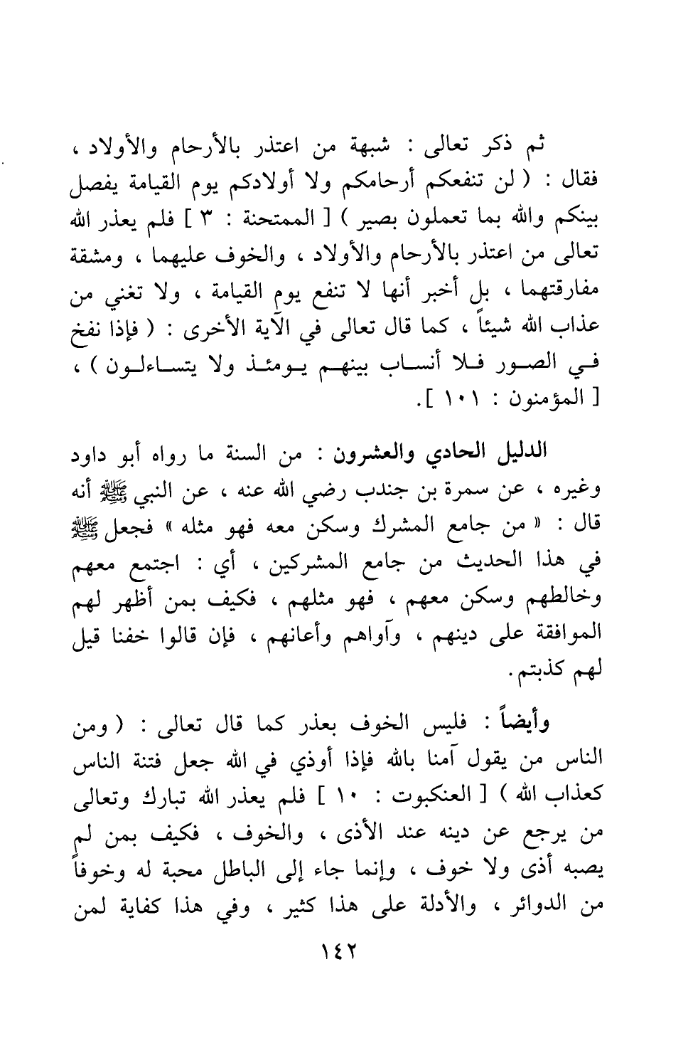 ثم ذكر تعالى شبهة من اعتذر بالأرحام والأولاد، فقال: {لَنْ تَنْفَعَكُمْ أَرْحَامُكُمْ وَلا أَوْلادُكُمْ يَوْمَ الْقِيَامَةِ يَفْصِلُ بَيْنَكُمْ وَاللَّهُ بِمَا تَعْمَلُونَ بَصِيرٌ} [سورة الممتحنة آية: 3] ، فلم يعذر الله تعالى من اعتذر بالأرحام والأولاد، والخوف عليهما، ومشقة مفارقتهما، بل أخبر أنها لا تنفع يوم القيامة، ولا تغني من عذاب الله شيئاً، كما قال تعالى في الآية الأخرى: {فَإِذَا نُفِخَ فِي الصُّورِ فَلا أَنْسَابَ بَيْنَهُمْ يَوْمَئِذٍ وَلا يَتَسَاءَلُونَ} [سورة المؤمنون آية: 101] .