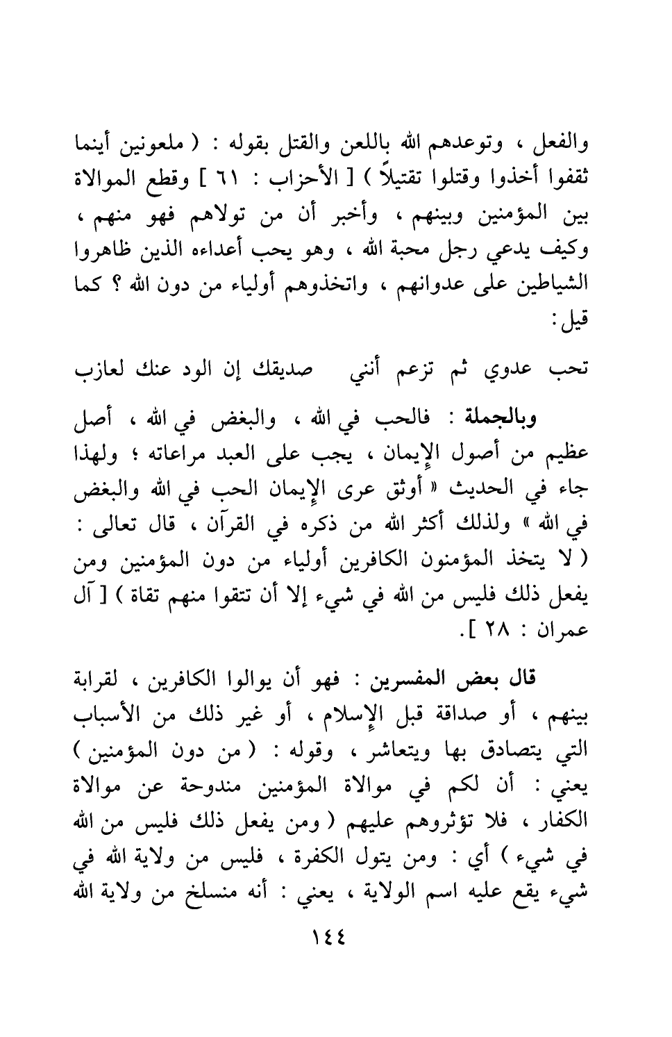 وبالجملة: فالحب في الله، والبغض في الله، أصل عظيم من أصول الإيمان، يجب على العبد مراعاته; ولهذا جاء في الحديث: " أوثق عرى الإيمان: الحب في الله والبغض في الله " 1، ولذلك أكثر الله من ذكره في القرآن، قال تعالى: {لا يَتَّخِذِ الْمُؤْمِنُونَ الْكَافِرِينَ أَوْلِيَاءَ مِنْ دُونِ الْمُؤْمِنِينَ وَمَنْ يَفْعَلْ ذَلِكَ فَلَيْسَ مِنَ اللَّهِ فِي شَيْءٍ إِلَّا أَنْ تَتَّقُوا مِنْهُمْ تُقَاةً} [سورة آل عمران آية: 28] . قال بعض المفسرين: فهو: أن يوالوا الكافرين، لقرابة بينهم، أو صداقة قبل الإسلام، أو غير ذلك من الأسباب التي يتصادق بها ويتعاشر، وقوله: {مِنْ دُونِ الْمُؤْمِنِينَ} يعني: أن لكم في موالاة المؤمنين مندوحة عن موالاة الكفار، فلا تؤثروهم عليهم. {وَمَنْ يَفْعَلْ ذَلِكَ فَلَيْسَ مِنَ اللَّهِ فِي شَيْءٍ} [سورة آل عمران آية: 28] أي: ومن يتول الكفرة، فليس من ولاية الله في شيء يقع عليه اسم الولاية، يعني: أنه منسلخ من ولاية الله