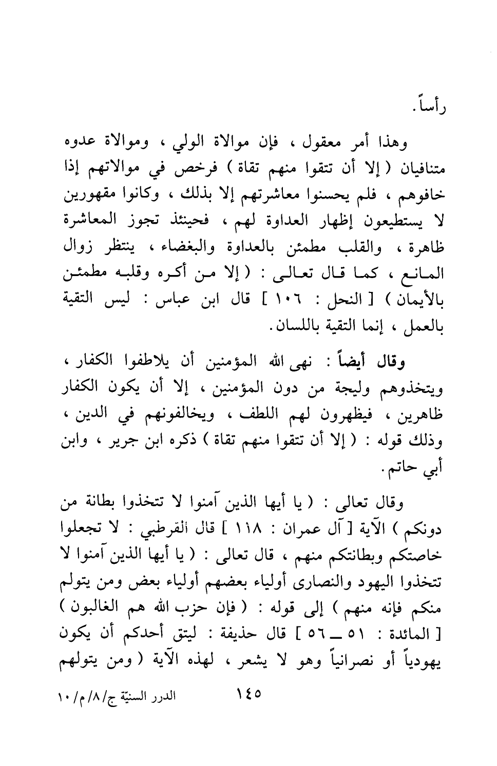 رأساً. وهذا أمر معقول، فإن موالاة الولي، وموالاة عدوه متنافيان. {إِلَّا أَنْ تَتَّقُوا مِنْهُمْ تُقَاةً} [سورة آل عمران آية: 28] ، فرخص في موالاتهم إذا خافوهم، فلم يحسنوا معاشرتهم إلا بذلك، وكانوا مقهورين لا يستطيعون إظهار العداوة لهم، فحينئذ تجوز المعاشرة ظاهرة، والقلب مطمئن بالعداوة والبغضاء، ينتظر زوال المانع، كما قال تعالى: {إِلَّا مَنْ أُكْرِهَ وَقَلْبُهُ مُطْمَئِنٌّ بِالْأِيمَانِ} [سورة النحل آية: 106] ، قال ابن عباس: "ليس التقية بالعمل، إنما التقية باللسان".