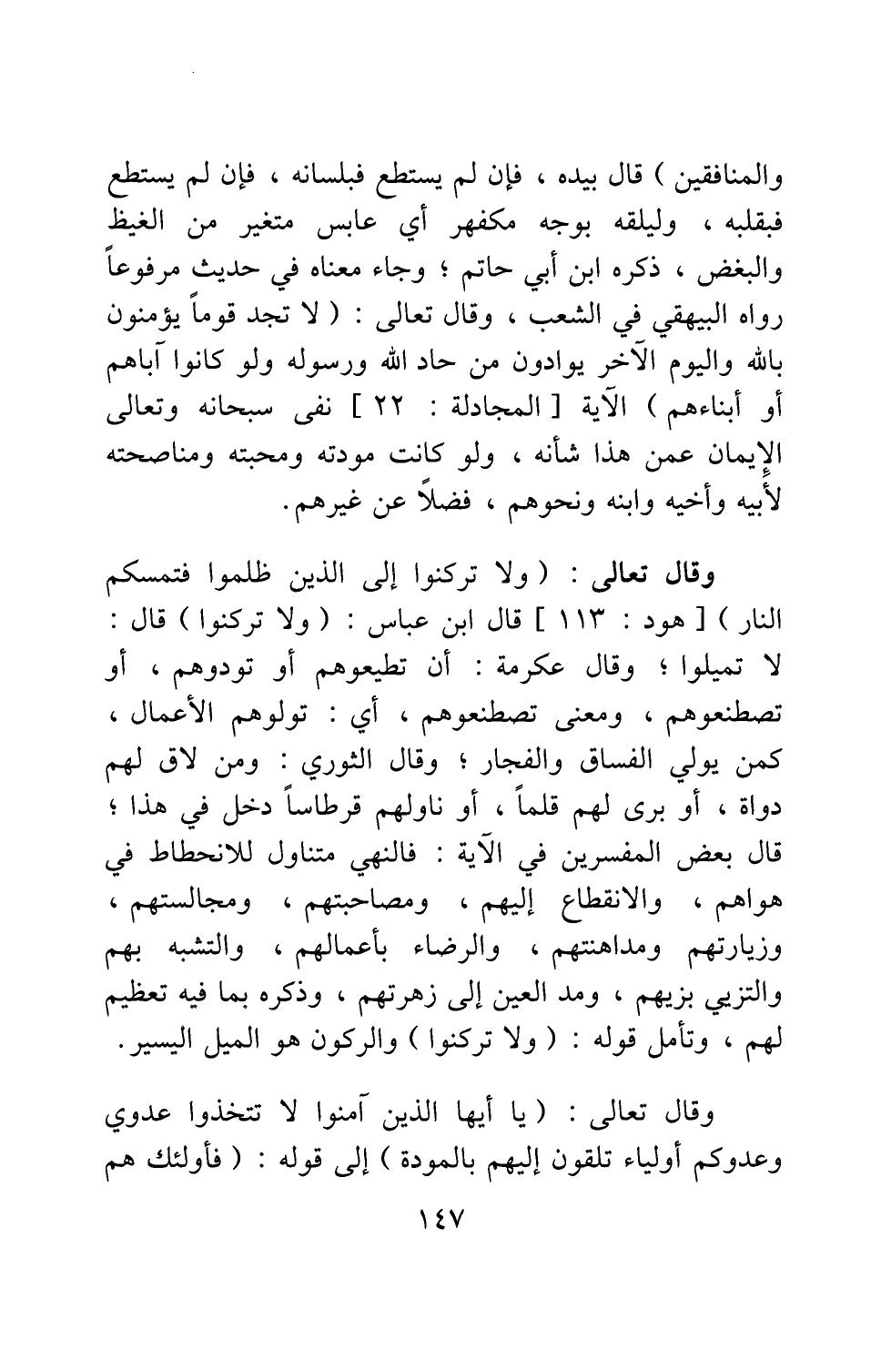 وَالْمُنَافِقِينَ} [سورة التوبة آية: 73] . قال: "بيده، فإن لم يستطع فبلسانه، فإن لم يستطع فبقلبه؛ وليلقه بوجه مكفهر"، أي: عابس متغير من الغيظ والبغض، ذكره ابن أبي حاتم، وجاء معناه في حديث مرفوعاً رواه البيهقي في الشعب. وقال تعالى: {لا تَجِدُ قَوْماً يُؤْمِنُونَ بِاللَّهِ وَالْيَوْمِ الْآخِرِ يُوَادُّونَ مَنْ حَادَّ اللَّهَ وَرَسُولَهُ وَلَوْ كَانُوا آبَاءَهُمْ أَوْ أَبْنَاءَهُمْ} الآية [سورة المجادلة آية: 22] ، نفى سبحانه وتعالى الإيمان عمن هذا شأنه، ولو كانت مودته ومحبته ومناصحته لأبيه وأخيه وابنه ونحوهم، فضلاً عن غيرهم.