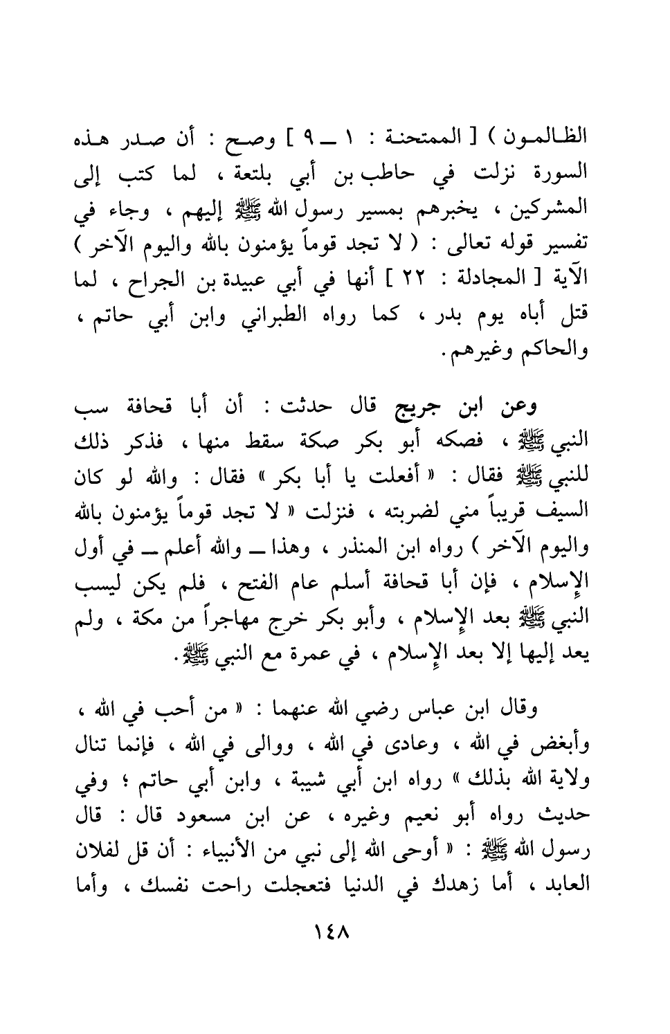 الظالمون} [سورة الممتحنة آية: 1] . وصح: أن صدر هذه السورة نزلت في حاطب بن أبي بلتعة، لما كتب إلى المشركين يخبرهم بمسير رسول الله صلى الله عليه وسلم إليهم، وجاء في تفسير قوله تعالى: {لا تَجِدُ قَوْماً يُؤْمِنُونَ بِاللَّهِ وَالْيَوْمِ الْآخِرِ} الآية [سورة المجادلة آية: 22] ، أنها "في أبي عبيدة بن الجراح، لما قتل أباه يوم بدر"، كما رواه الطبراني وابن أبي حاتم، والحاكم وغيرهم.