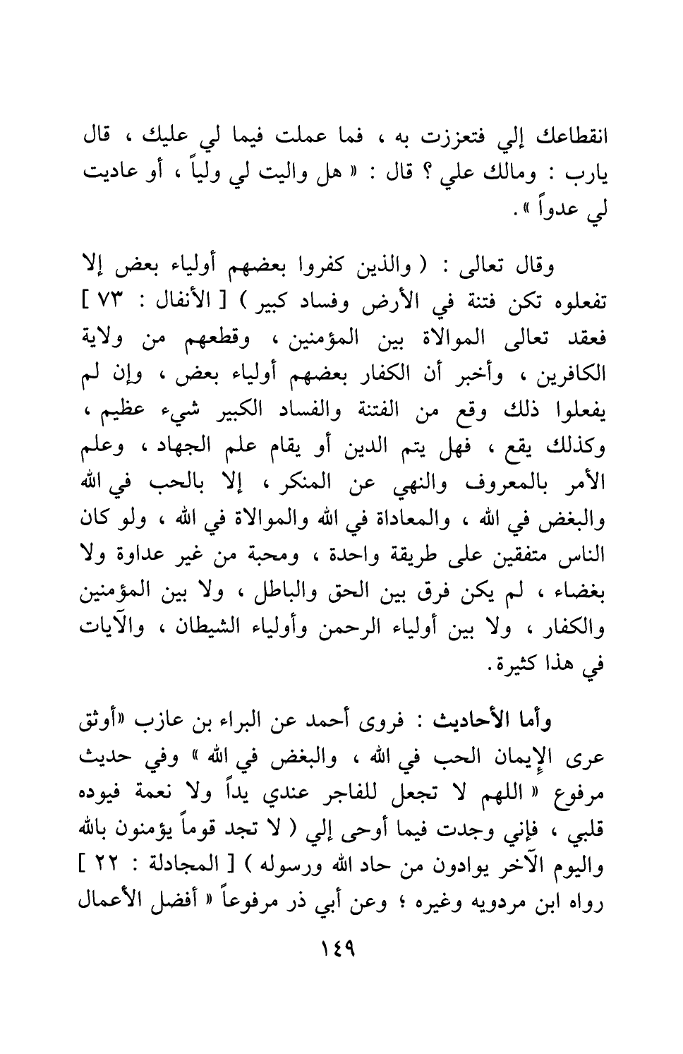 وقال تعالى: {وَالَّذِينَ كَفَرُوا بَعْضُهُمْ أَوْلِيَاءُ بَعْضٍ إِلَّا تَفْعَلُوهُ تَكُنْ فِتْنَةٌ فِي الْأَرْضِ وَفَسَادٌ كَبِيرٌ} [سورة الأنفال آية: 73] ، فعقد تعالى الموالاة بين المؤمنين، وقطعهم من ولاية الكافرين، وأخبر أن الكفار بعضهم أولياء بعض، وإن لم يفعلوا ذلك وقع من الفتنة والفساد الكبير شيء عظيم، وكذلك يقع؛ فهل يتم الدين أو يقام علم الجهاد، وعلم الأمر بالمعروف والنهي عن المنكر، إلا بالحب في الله والبغض في الله، والمعاداة في الله والموالاة في الله؟ ولو كان الناس متفقين على طريقة واحدة، ومحبة من غير عداوة ولا بغضاء، لم يكن فرق بين الحق والباطل، ولا بين المؤمنين والكفار، ولا بين أولياء الرحمن وأولياء الشيطان؛ والآيات في هذا كثيرة.