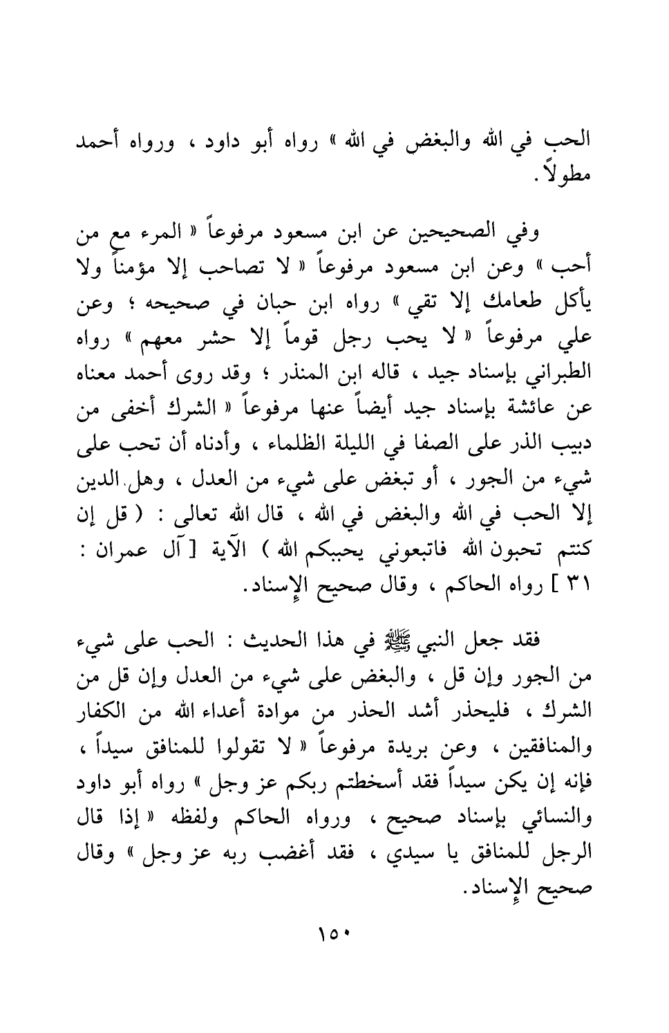 فقد جعل النبي صلى الله عليه وسلم، في هذا الحديث، الحب على شيء من الجور وإن قل، والبغض على شيء من العدل وإن قل، من الشرك؛ فليحذر أشد الحذر من موادة أعداء الله من الكفار والمنافقين. وعن بريدة مرفوعاً: " لا تقولوا للمنافق سيداً، فإنه إن يكن سيداً فقد أسخطتم ربكم عز وجل " 5، رواه أبو داود والنسائي بإسناد صحيح، ورواه الحاكم ولفظه: " إذا قال الرجل للمنافق: يا سيدي، فقد أغضب ربه عز وجل " 6، وقال: صحيح الإسناد.