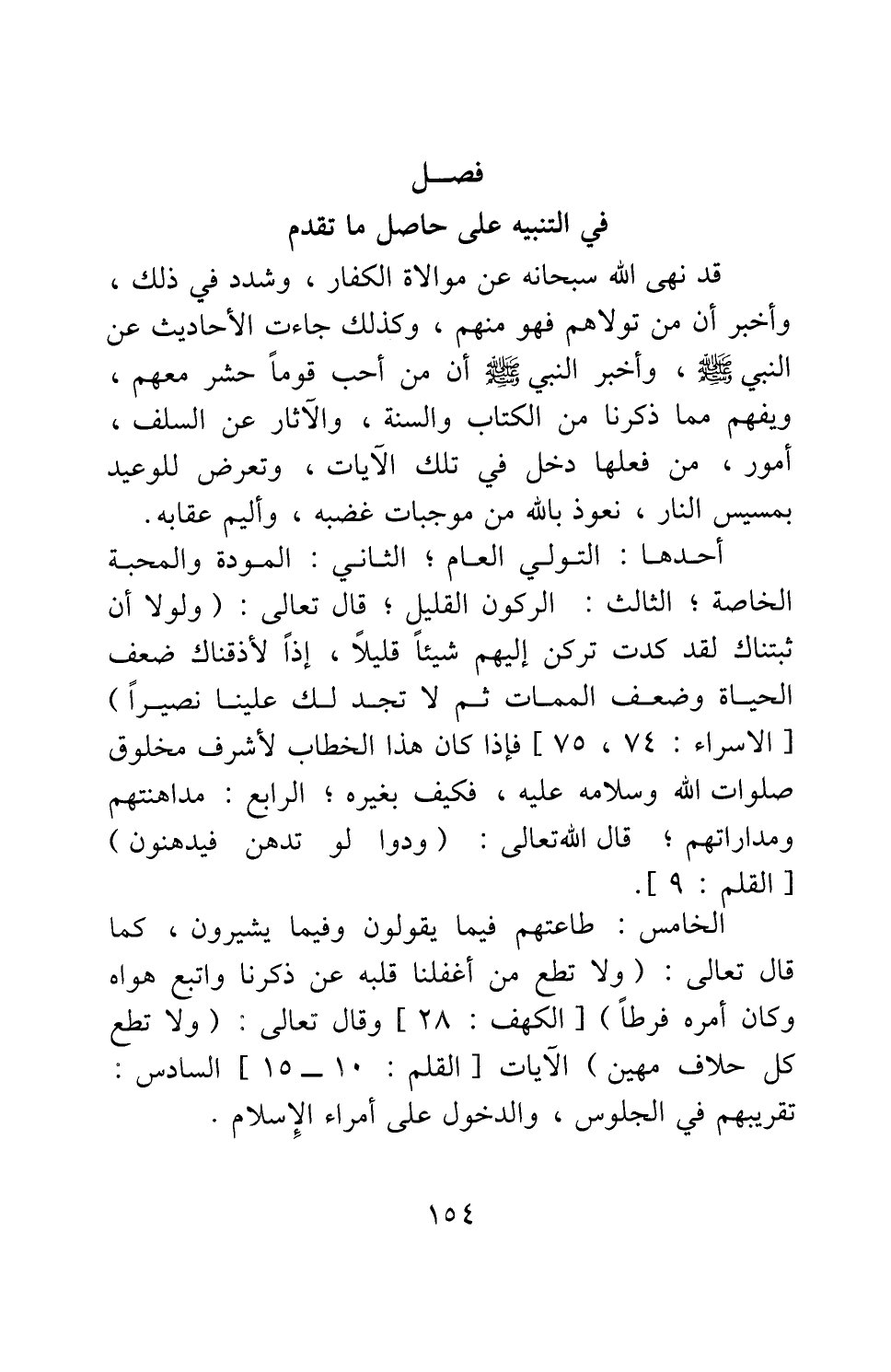 قد نهى الله سبحانه عن موالاة الكفار، وشدد في ذلك، وأخبر أن من تولاهم فهو منهم، وكذلك جاءت الأحاديث عن النبي صلى الله عليه وسلم، وأخبر النبي صلى الله عليه وسلم أن من أحب قوماً حُشر معهم؛ ويُفهم مما ذكرنا من الكتاب والسنة، والآثار عن السلف، أمور، مَن فعلها دخل في تلك الآيات، وتعرض للوعيد بمسيس النار، نعوذ بالله من موجبات غضبه، وأليم عقابه.