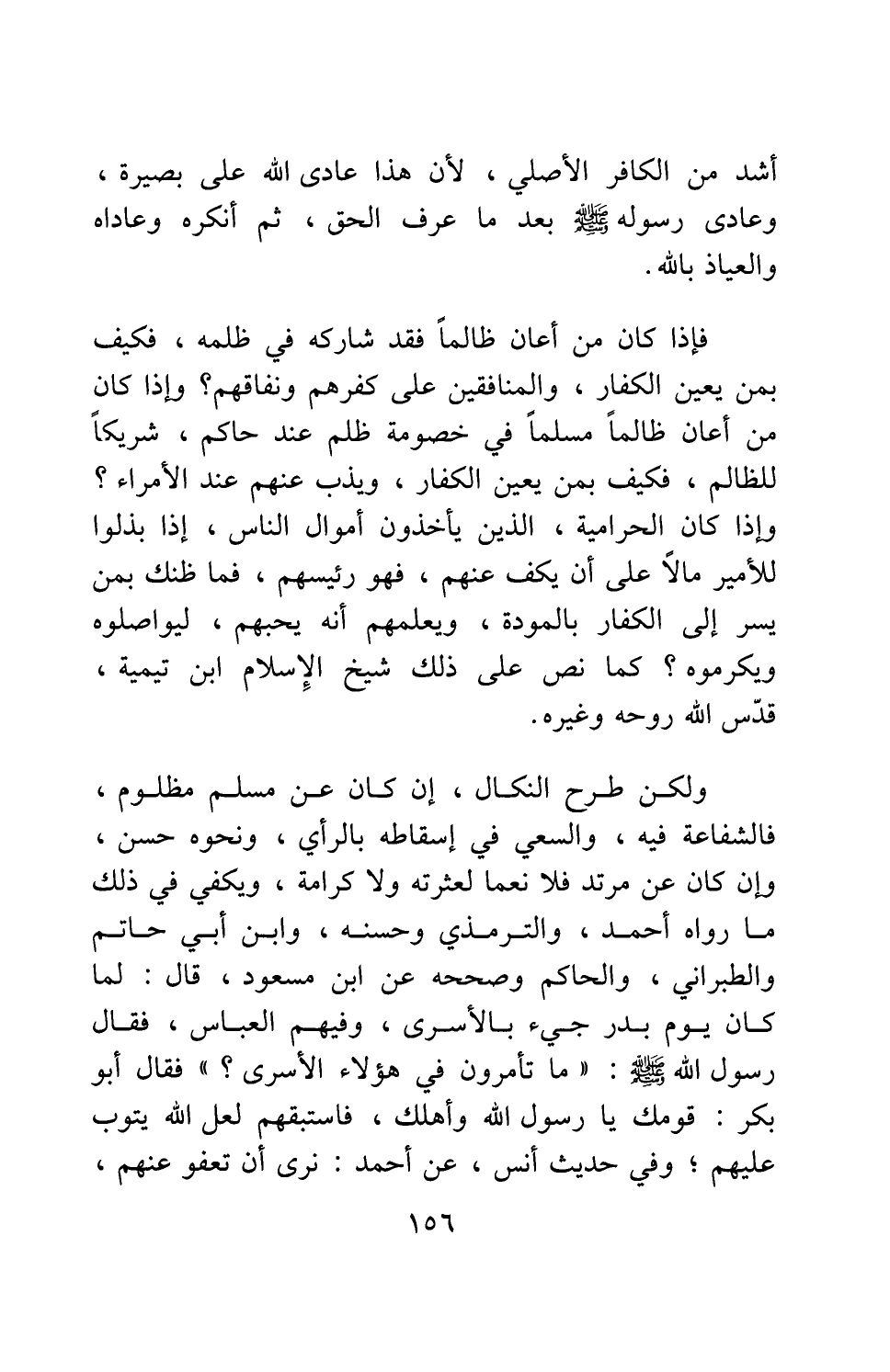 ولكن طرح النكال، إن كان عن مسلم مظلوم، فالشفاعة فيه، والسعي في إسقاطه بالرأي ونحوه، حسن، وإن كان عن مرتد، فلا نعما لعثرته ولا كرامة؛ ويكفي في ذلك ما رواه أحمد، والترمذي وحسنه، وابن أبي حاتم والطبراني، والحاكم وصححه، عن ابن مسعود قال: " لما كان يوم بدر جيء بالأسرى، وفيهم العباس، فقال رسول الله صلى الله عليه وسلم: ما تأمرون في هؤلاء الأسرى؟ فقال أبو بكر: قومك يا رسول الله وأهلك، فاستبقهم لعل الله يتوب عليهم "، وفي حديث أنس، عن أحمد: " نرى أن تعفو عنهم،