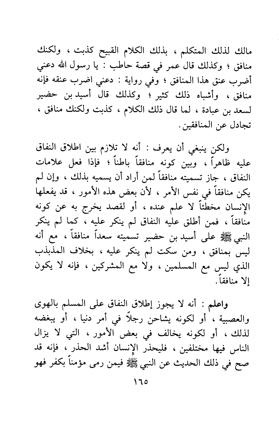 مالك لذلك المتكلم بذلك الكلام القبيح: "كذبت، ولكنك منافق"; وكذلك قال عمر في قصة حاطب: "يا رسول الله دعني أضرب عنق هذا المنافق"; وفي رواية: "دعني أضرب عنقه فإنه منافق"، وأشباه ذلك كثير. وكذلك قال أسيد بن حضير لسعد بن عبادة، لما قال ذلك الكلام: "كذبت ولكنك منافق، تجادل عن المنافقين". ولكن ينبغي أن يعرف: أنه لا تلازم بين إطلاق النفاق عليه ظاهراً، وبين كونه منافقاً باطناً; فإذا فعل علامات النفاق، جاز تسميته منافقاً لمن أراد أن يسميه بذلك، وإن لم يكن منافقاً في نفس الأمر، لأن بعض هذه الأمور قد يفعلها الإنسان مخطئاً لا علم عنده، أو لقصد يخرج به عن كونه منافقاً، فمن أطلق عليه النفاق لم ينكر عليه، كما لم ينكر النبي صلى الله عليه وسلم على أسيد بن حضير تسميته سعداً منافقاً، مع أنه ليس بمنافق، ومن سكت لم ينكر عليه، بخلاف المذبذب الذي ليس مع المسلمين، ولا مع المشركين، فإنه لا يكون إلا منافقاً.
