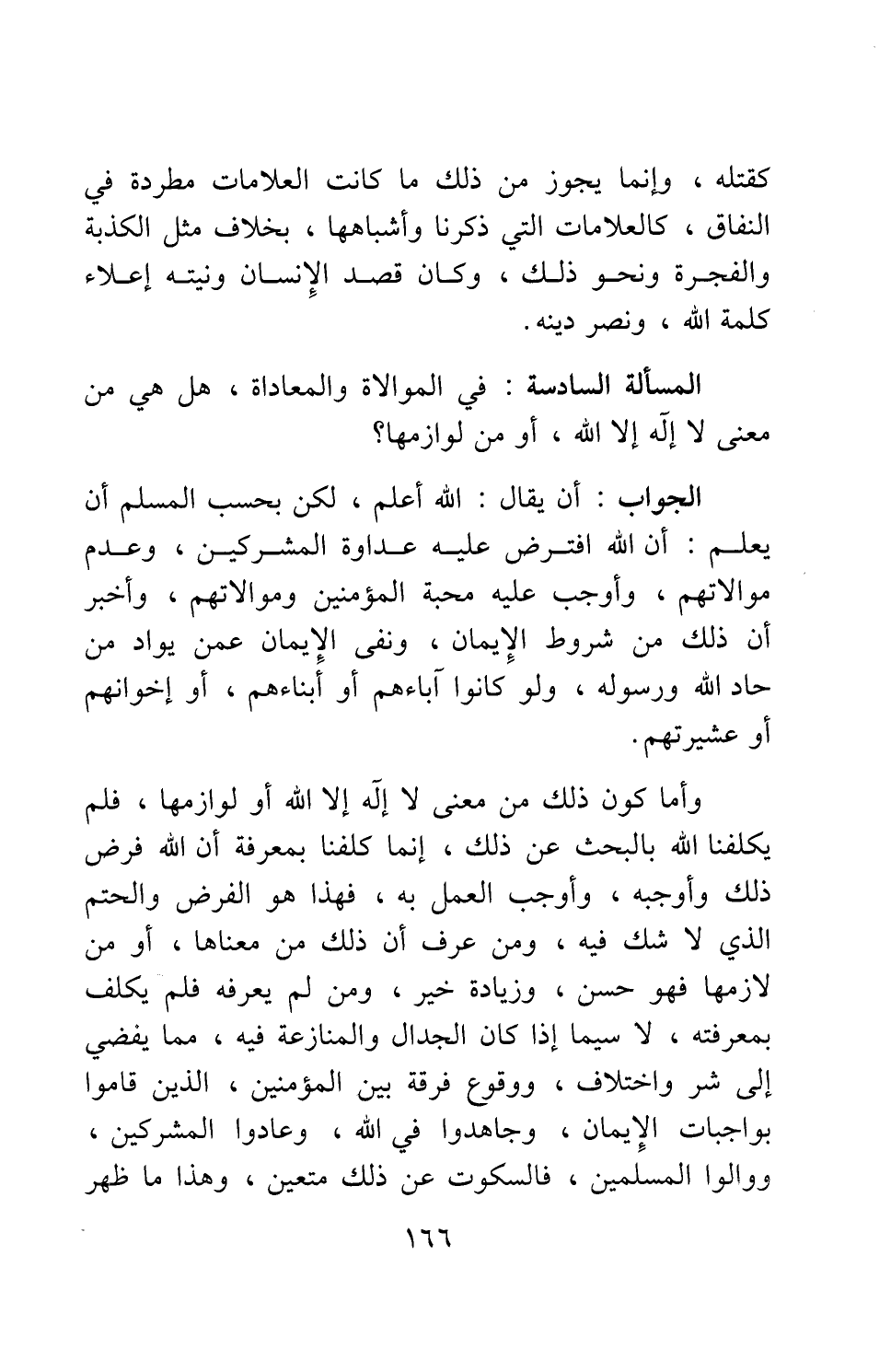 المسألة السادسة: في الموالاة والمعاداة، هل هي من معنى لا إله إلا الله، أو من لوازمها؟