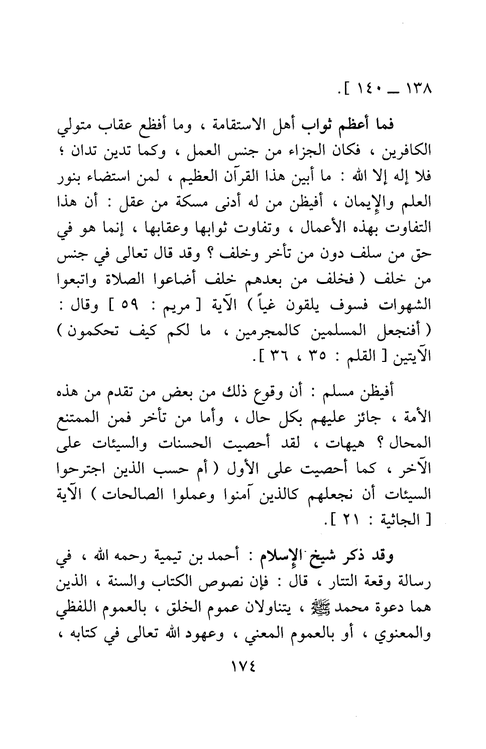 فما أعظم ثواب أهل الاستقامة! وما أفظع عقاب متولي الكافرين! فكان الجزاء من جنس العمل، وكما تدين تدان؛ فلا إله إلا الله، ما أبين هذا القرآن العظيم، لمن استضاء بنور العلم والإيمان! أفيظن من له أدنى مسكة من عقل، أن هذا التفاوت بهذه الأعمال، وتفاوت ثوابها وعقابها، إنما هو في حق من سلف دون من تأخر وخلف؟ وقد قال تعالى في جنس من خلف: {فَخَلَفَ مِنْ بَعْدِهِمْ خَلْفٌ أَضَاعُوا الصَّلاةَ وَاتَّبَعُوا الشَّهَوَاتِ فَسَوْفَ يَلْقَوْنَ غَيّاً} الآية [سورة مريم آية: 59] ، وقال: {أَفَنَجْعَلُ الْمُسْلِمِينَ كَالْمُجْرِمِينَ مَا لَكُمْ كَيْفَ تَحْكُمُونَ} الآيتين [سورة القلم آية: 35-36] .
