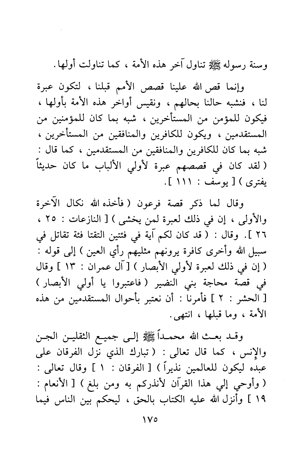 وقال لما ذكر قصة فرعون: {فَأَخَذَهُ اللَّهُ نَكَالَ الْآخِرَةِ وَالْأُولَى إِنَّ فِي ذَلِكَ لَعِبْرَةً لِمَنْ يَخْشَى} [سورة النازعات آية: 25-26] ، وقال: {قَدْ كَانَ لَكُمْ آيَةٌ فِي فِئَتَيْنِ الْتَقَتَا فِئَةٌ تُقَاتِلُ فِي سَبِيلِ اللَّهِ وَأُخْرَى كَافِرَةٌ يَرَوْنَهُمْ مِثْلَيْهِمْ رَأْيَ الْعَيْنِ} إلى قوله: {إِنَّ فِي ذَلِكَ لَعِبْرَةً لِأُولِي الْأَبْصَارِ} [سورة آل عمران آية: 13] ، وقال في قصة محاجة بني النضير: {فَاعْتَبِرُوا يَا أُولِي الْأَبْصَارِ} [سورة الحشر آية: 2] ، فأمرنا أن نعتبر بأحوال المستقدمين من هذه الأمة، وما قبلها. انتهى.