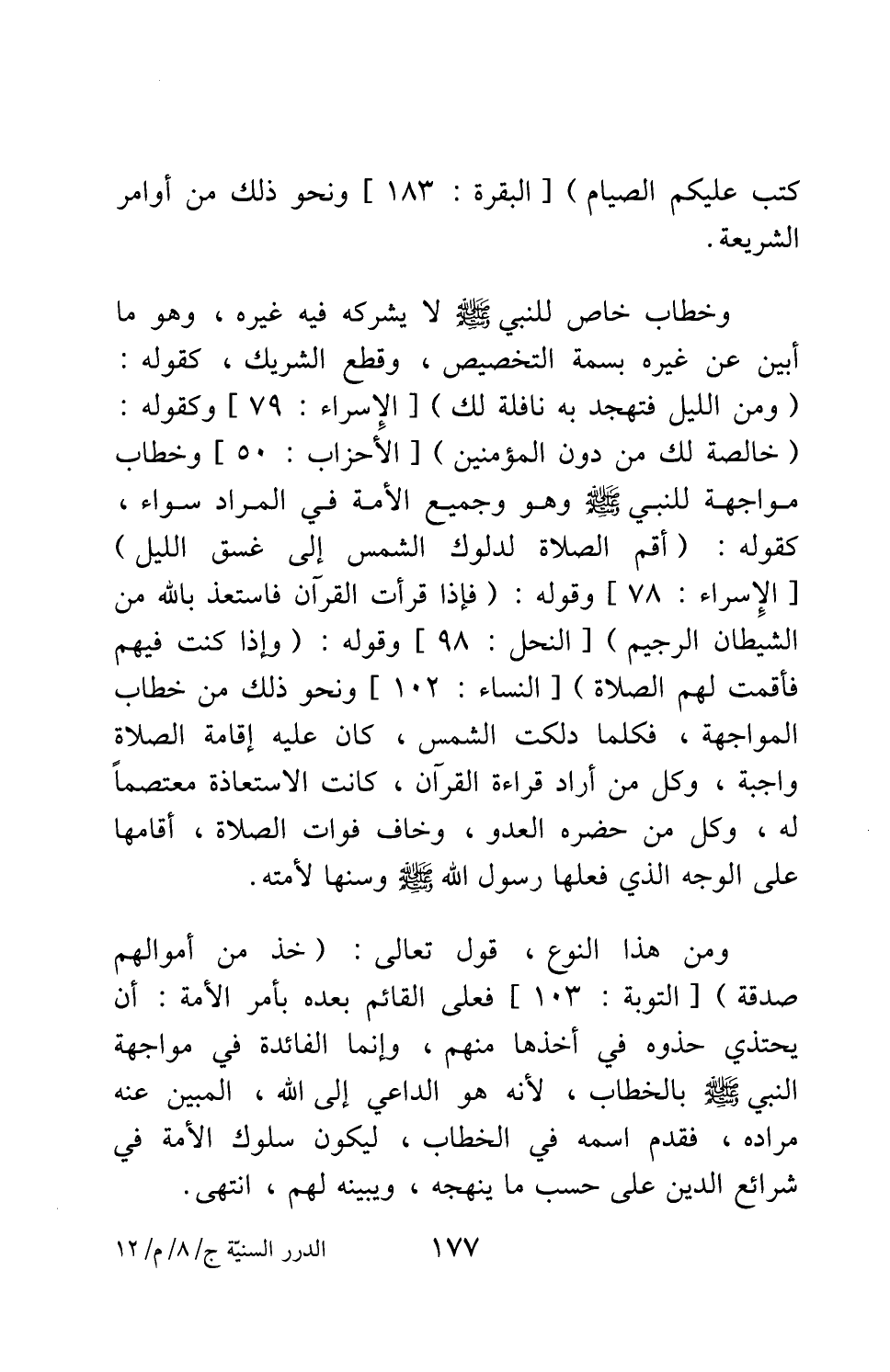 وخطاب خاص للنبي صلى الله عليه وسلم، لا يشركه فيه غيره، وهو ما أبين عن غيره بسمة التخصيص، وقطع الشريك، كقوله: {وَمِنَ اللَّيْلِ فَتَهَجَّدْ بِهِ نَافِلَةً لَكَ} [سورة الإسراء آية: 79] ، وكقوله: {خَالِصَةً لَكَ مِنْ دُونِ الْمُؤْمِنِينَ} [سورة الأحزاب آية: 50] ، وخطاب مواجهة للنبي صلى الله عليه وسلم، وهو وجميع الأمة في المراد سواء، كقوله: {أَقِمِ الصَّلاةَ لِدُلُوكِ الشَّمْسِ إِلَى غَسَقِ اللَّيْلِ} [سورة الإسراء آية: 78] ، وقوله: {فَإِذَا قَرَأْتَ الْقُرْآنَ فَاسْتَعِذْ بِاللَّهِ مِنَ الشَّيْطَانِ الرَّجِيمِ} [سورة النحل آية: 98] ، وقوله: {وَإِذَا كُنْتَ فِيهِمْ فَأَقَمْتَ لَهُمُ الصَّلاةَ} [سورة النساء آية: 102] ، ونحو ذلك من خطاب المواجهة؛ فكلما دلكت الشمس، كان عليه إقامة الصلاة واجبة، وكل من أراد قراءة القرآن، كانت الاستعاذة معتصماً له، وكل من حضره العدو وخاف فوات الصلاة، أقامها على الوجه الذي فعلها رسول الله صلى الله عليه وسلم وسنها لأمته.